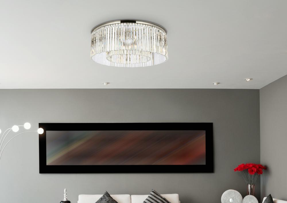 Timeless splendor and modern refinement are brought together in flush-mount Sydney fixtures. Dazzling in dining rooms, staircases, or hallways, the Sydney collection flaunts stunning tiers of royal-cut crystals in clear, golden teak, or Silver shade. A circular mocha-brown or polished-nickel finished steel frame adds understated charm to this stunning flush-mount lamp.