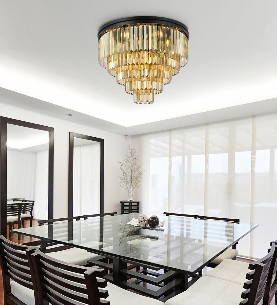 Timeless splendor and modern refinement are brought together in flush-mount Sydney fixtures. Dazzling in dining rooms, staircases, or hallways, the Sydney collection flaunts stunning tiers of royal-cut crystals in clear, golden teak, or Silver shade. A circular Matte Black or polished-nickel finished steel frame adds understated charm to this stunning flush-mount lamp.