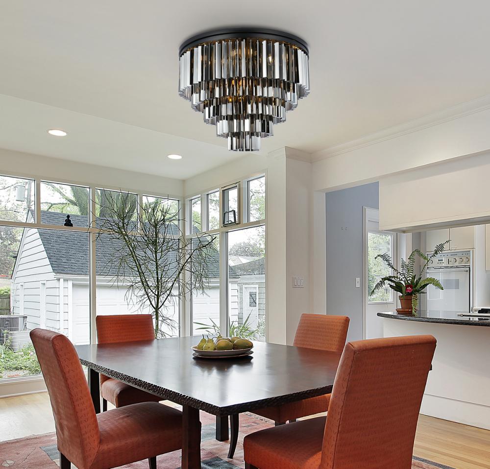 Timeless splendor and modern refinement are brought together in flush-mount Sydney fixtures. Dazzling in dining rooms, staircases, or hallways, the Sydney collection flaunts stunning tiers of royal-cut crystals in clear, golden teak, or Silver shade. A circular Matte Black or polished-nickel finished steel frame adds understated charm to this stunning flush-mount lamp.