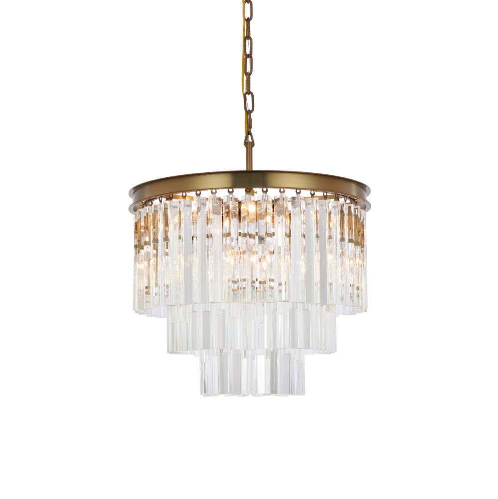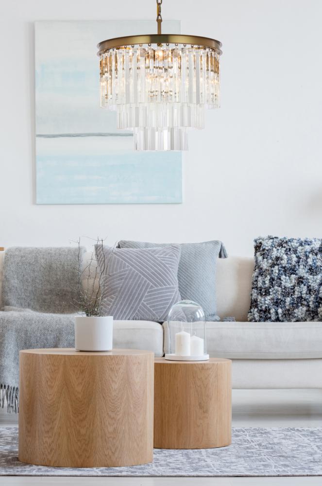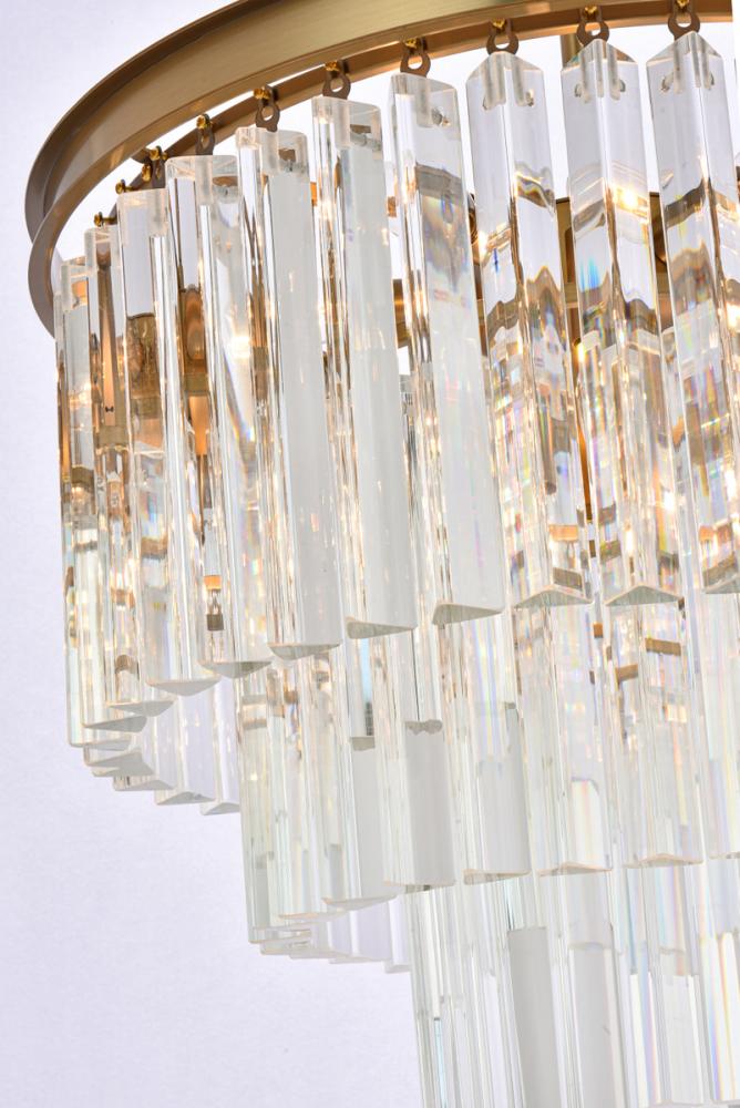 The round chandelier features 3 tiers of triangular slender crystal rods, providing a stunning cascade of shimmering light and creating a sense of opulence.