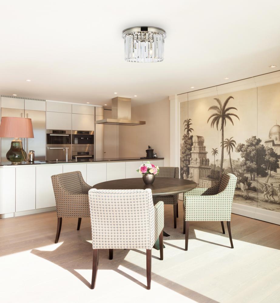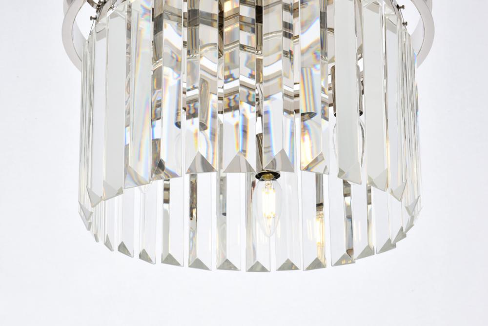 Timeless splendor and modern refinement are brought together in flush-mount Sydney fixtures. Dazzling in dining rooms, staircases, or hallways, the Sydney collection flaunts stunning tiers of royal-cut crystals in clear, golden teak, or Silver shade. A circular mocha-brown or polished-nickel finished steel frame adds understated charm to this stunning flush-mount lamp.