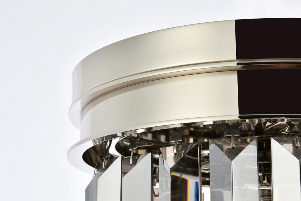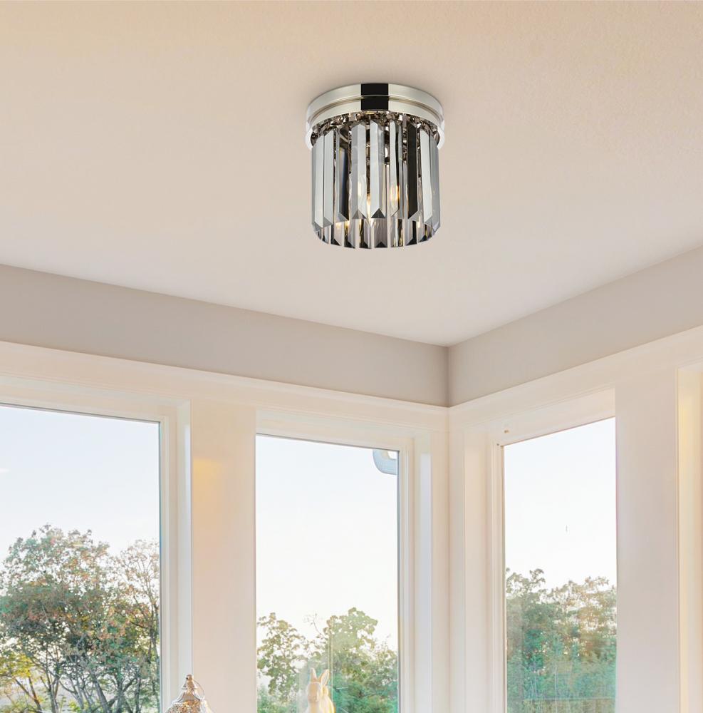 Timeless splendor and modern refinement are brought together in flush-mount Sydney fixtures. Dazzling in dining rooms, staircases, or hallways, the Sydney collection flaunts stunning tiers of royal-cut crystals in clear, golden teak, or Silver shade. A circular mocha-brown or polished-nickel finished steel frame adds understated charm to this stunning flush-mount lamp.