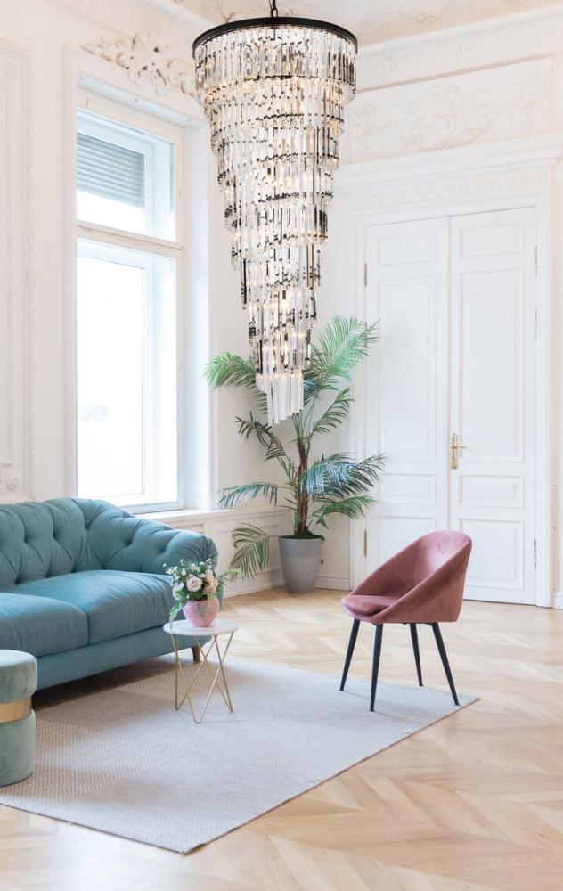 The interplay between the crystals and the light bulbs creates a dazzling effect, casting an enchanting glow throughout the room.