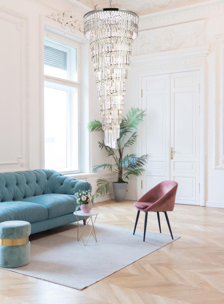 The interplay between the crystals and the light bulbs creates a dazzling effect, casting an enchanting glow throughout the room.