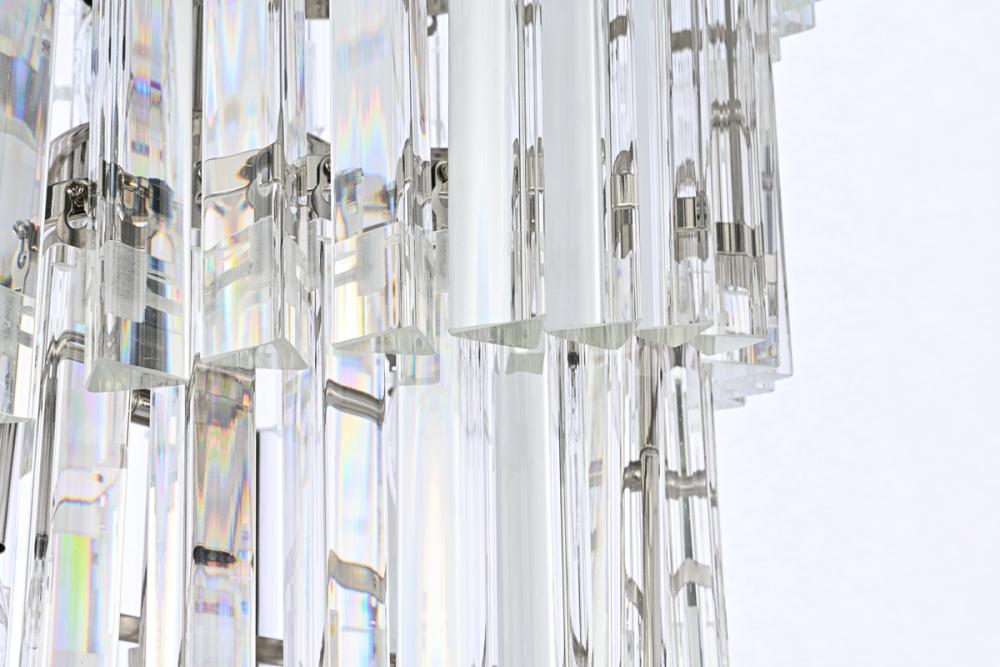 The chandelier features 3 tiers of triangular slender crystal rods, providing a stunning cascade of shimmering light and creating a sense of opulence.