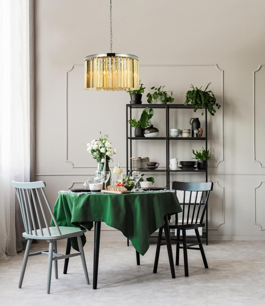 Lamp features a diameter of 26 inches, a height of 13.5 inches; requires 8 candelabra lights