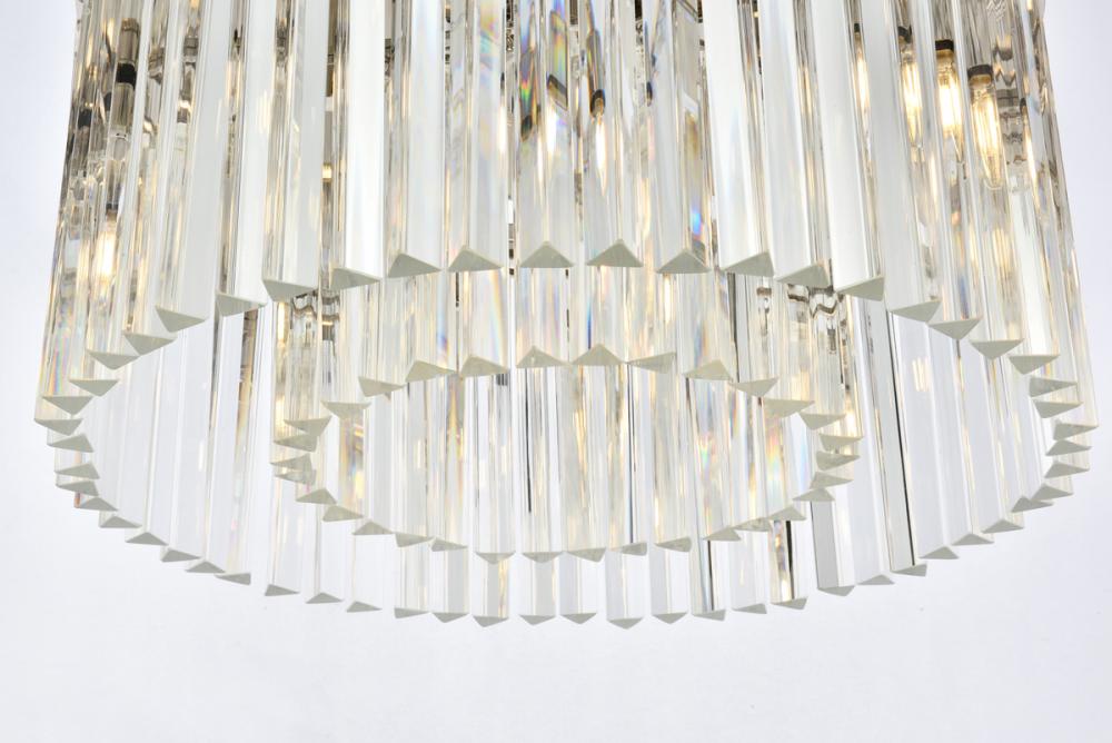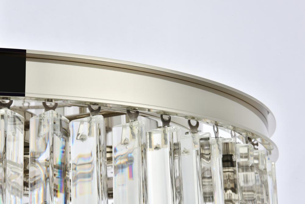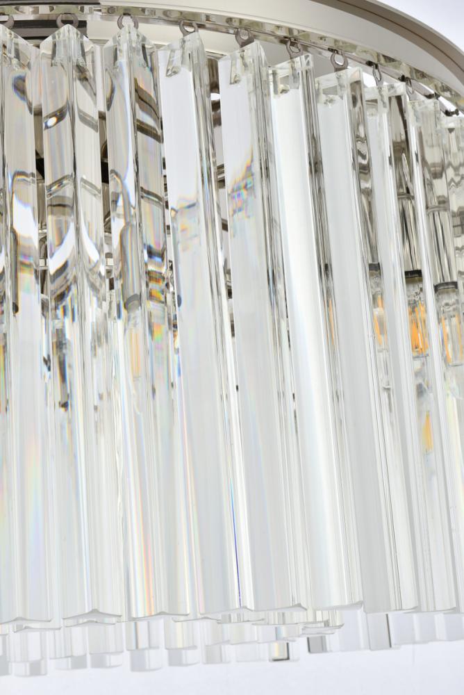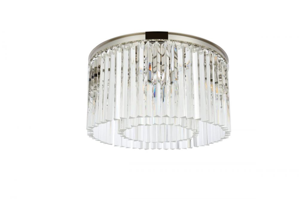 Timeless splendor and modern refinement are brought together in flush-mount Sydney fixtures. Dazzling in dining rooms, staircases, or hallways, the Sydney collection flaunts stunning tiers of royal-cut crystals in clear, golden teak, or Silver shade. A circular mocha-brown or polished-nickel finished steel frame adds understated charm to this stunning flush-mount lamp.
