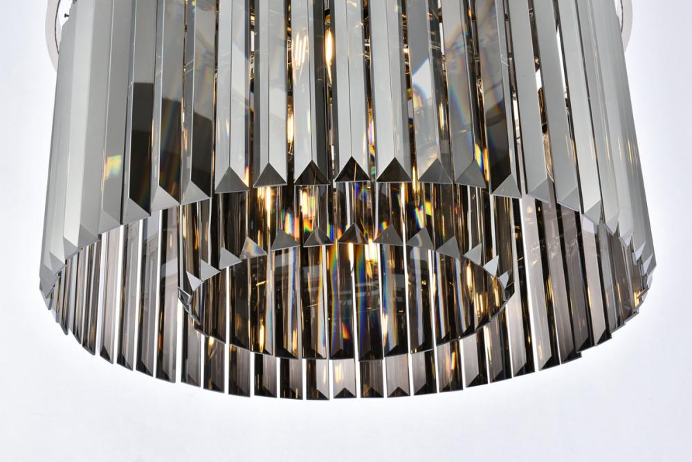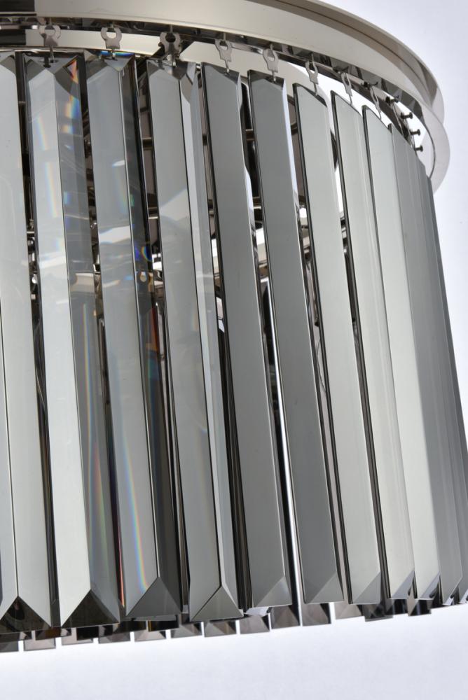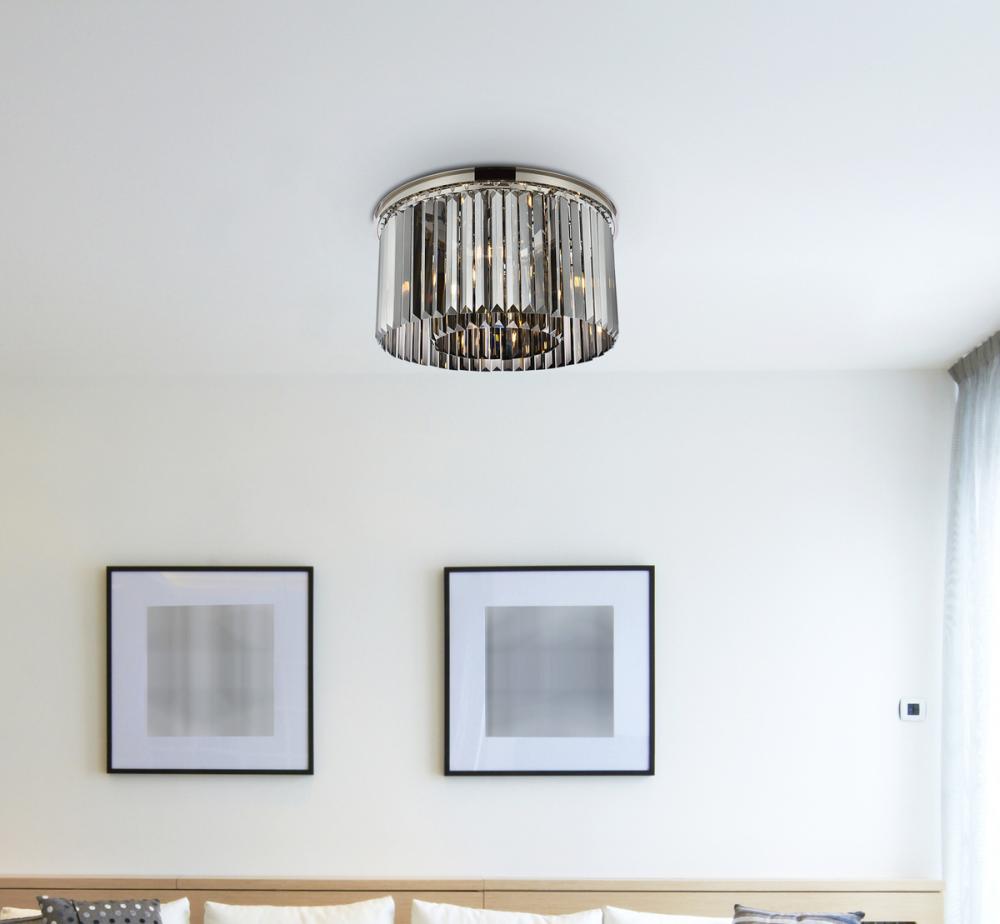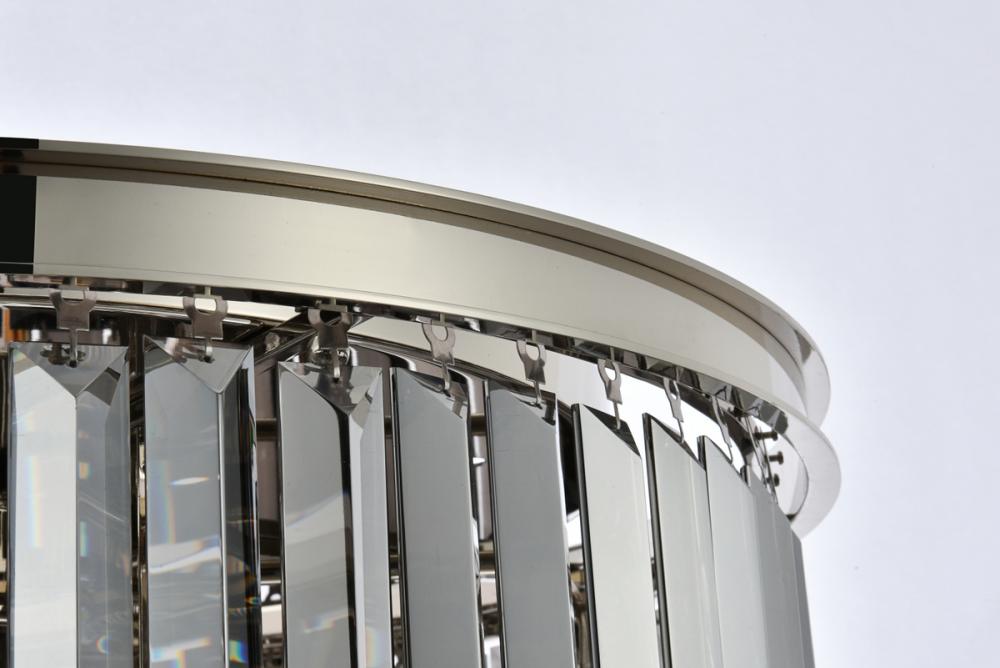 Timeless splendor and modern refinement are brought together in flush-mount Sydney fixtures. Dazzling in dining rooms, staircases, or hallways, the Sydney collection flaunts stunning tiers of royal-cut crystals in clear, golden teak, or Silver shade. A circular mocha-brown or polished-nickel finished steel frame adds understated charm to this stunning flush-mount lamp.