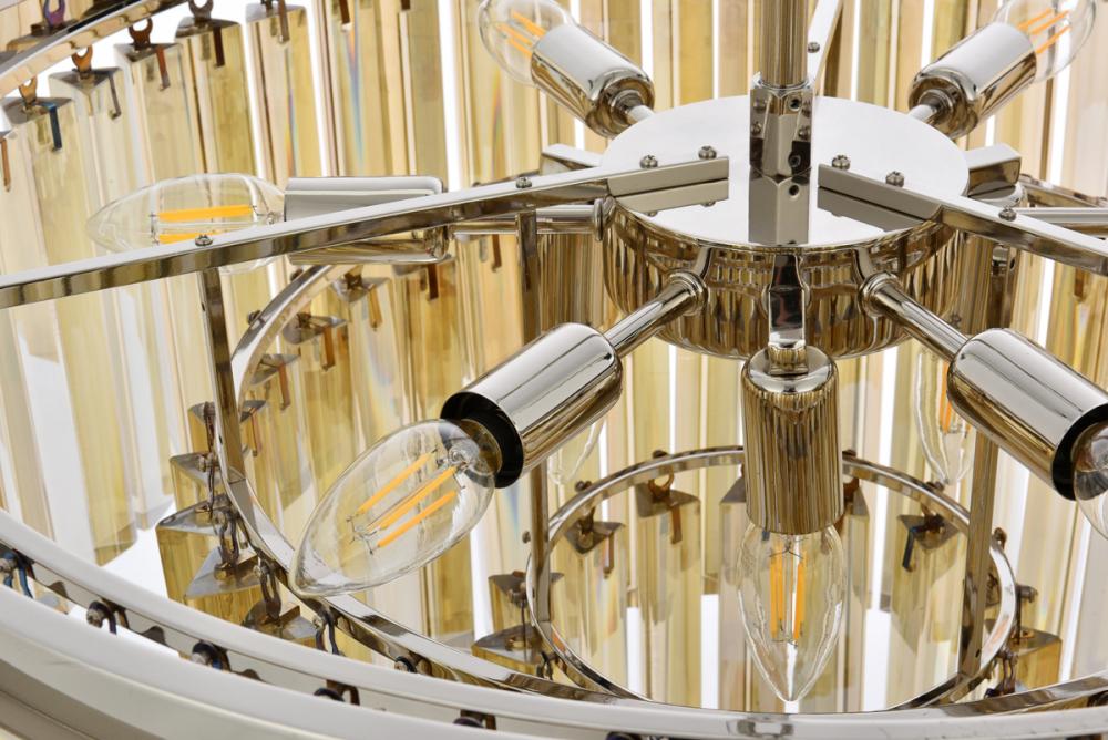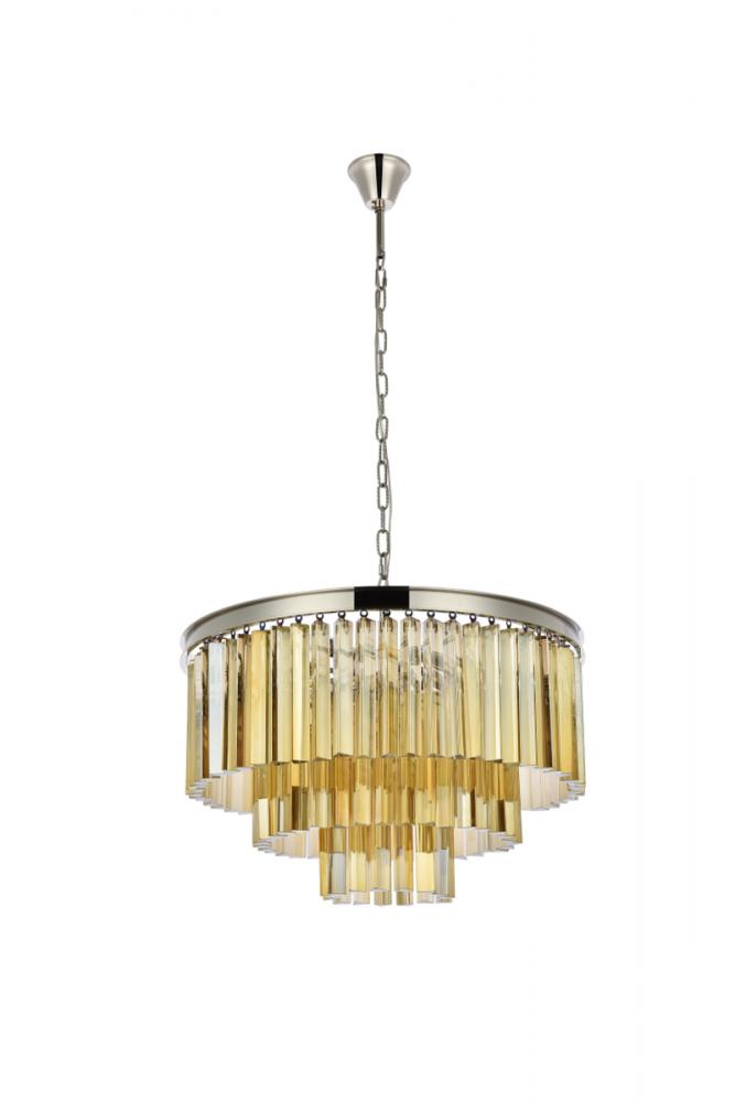 Bring the splendor of the ballroom into your home with a sparkling Sydney fixture. Stunning in foyers, dining rooms, or stairwells, the Sydney collection brings to mind the glamour of the Roaring Twenties. Features glimmering tiers of royal-cut clear, golden-teak, or Silver-shade crystals. In mocha-brown or polished-nickel finishes, this sturdy, yet delicate, chandelier will be the perfect centerpiece for any décor.