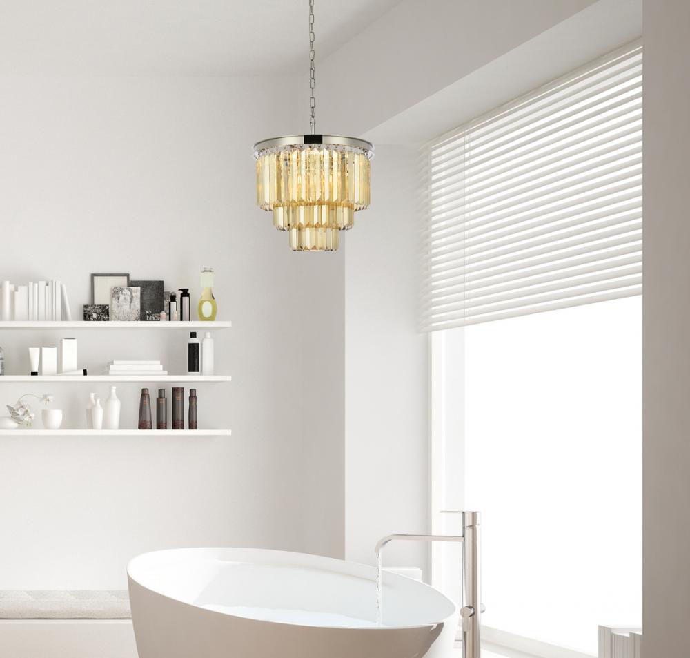 Bring the splendor of the ballroom into your home with a sparkling Sydney fixture. Stunning in foyers, dining rooms, or stairwells, the Sydney collection brings to mind the glamour of the Roaring Twenties. Features glimmering tiers of royal-cut clear, golden-teak, or Silver-shade crystals. In mocha-brown or polished-nickel finishes, this sturdy, yet delicate, pendant lamp will be the perfect centerpiece for any décor.