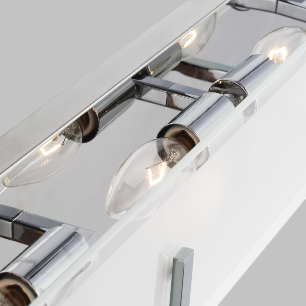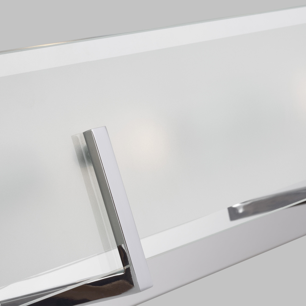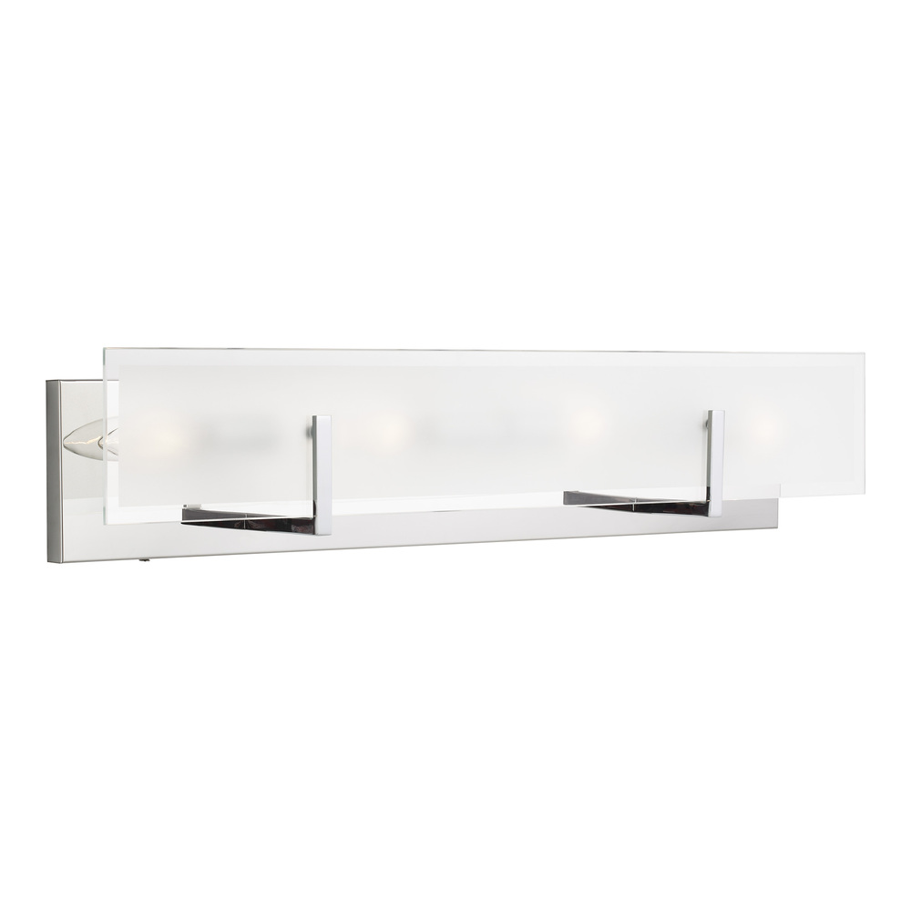 The Syll four light vanity fixture in chrome offers shadow-free lighting in your powder room, spa, or master bath room. Syll features a stylish frame with brilliant frosted beveled glass panels.