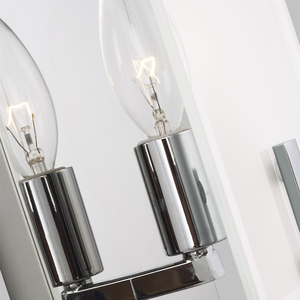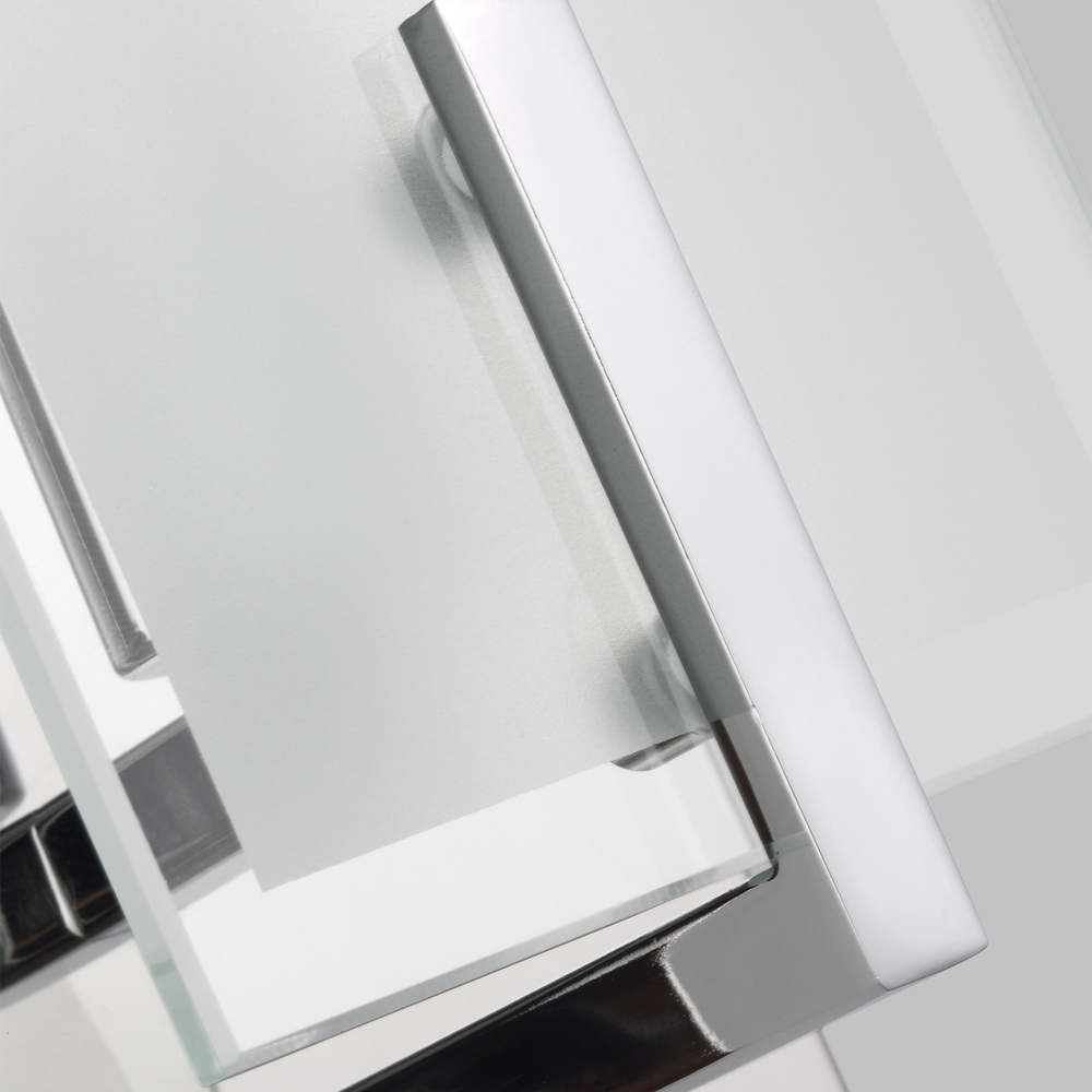 The Syll one light wall sconce in chrome offers shadow-free lighting in your powder room, spa, or master bath room. Syll features a stylish frame with brilliant frosted beveled glass panels.
