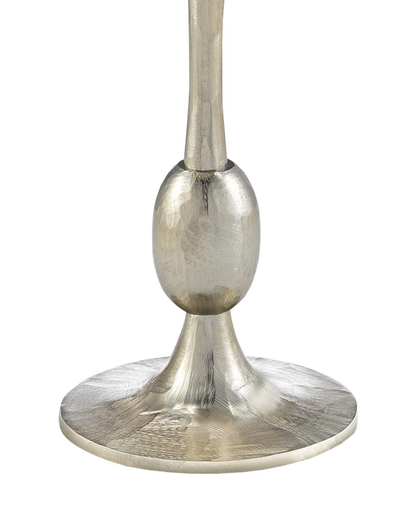 The shape of the Talia Champagne Accent Table is a riff on turned wood candle-sticks, but this silver accent table is made of cast aluminum in a champagne gold finish.