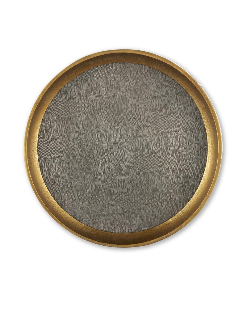 The Tanay Round Tray has an incredible mix of textures. First is the cast aluminum rim that has tell-tale pitting on its gleaming antique brass surface. Adding even more dynamism is the bottom of its interior that is stamped in a graphite snakeskin pattern. This masterpiece of artistry will be a scene-stealer when used to carry cocktails or appetizers.