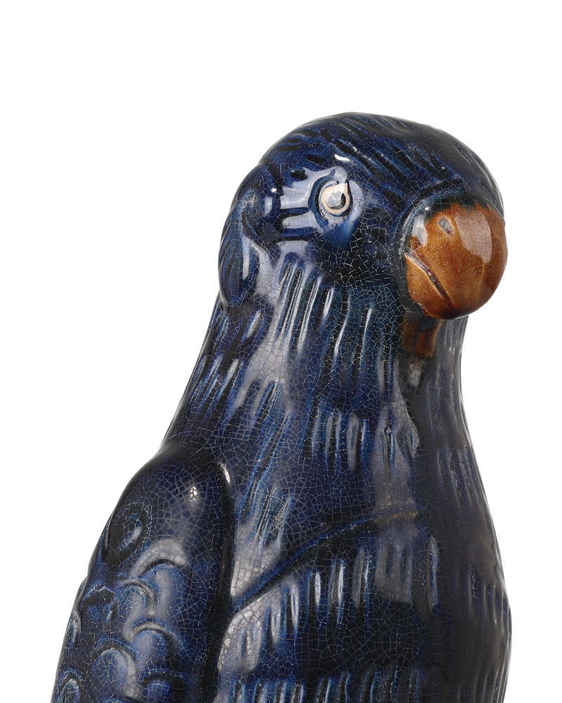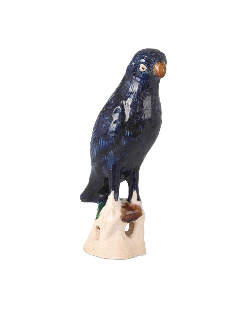 The Tang Dynasty Parrots Set is a pair of terracotta parrot sculptures. Each piece is glazed in antique blue and off-white, creating a timeworn finish reminiscent of traditional Tang Dynasty ceramics. A subtle crackle effect adds texture to the surface. Designed with small holes at the top, these decorative accessories can also serve as incense holders. Each of the Tang Dynasty Parrots will vary slightly because they are hand-glazed.