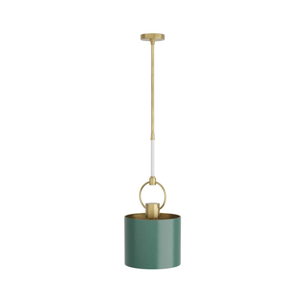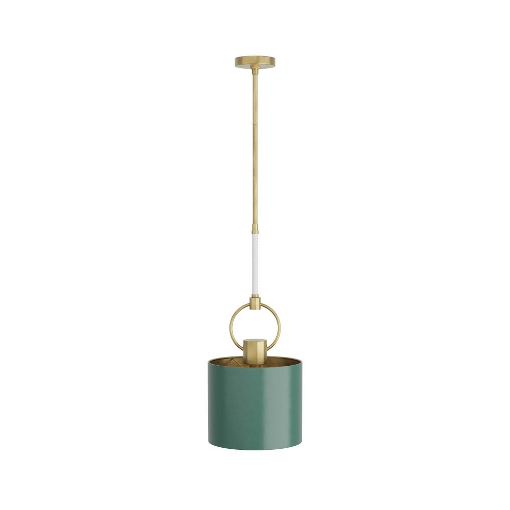 THE TARLOW PENDANT ADDS A STRIKING LAYER OF RICH COLOR INTO AN INTERIOR. DESIGNED WITH A PINE-COLORED STEEL DRUM SHADE AND FASHIONED WITH A DECORATIVE ANTIQUE-BRASS STEEL LOOP THAT BORROWS INSPIRATION FROM THE HOOKS ON TRADITIONAL GLASS. DOVE GRAY LEATHER WRAPS THE ANTIQUE-BRASS FINISHED STEEL SUSPENSION PIPE. DAMP-RATED, ALTHOUGH LIMITED COVERED OUTDOOR CONDITIONS MAY AFFECT FINISH.