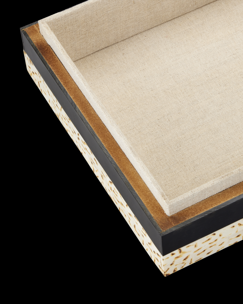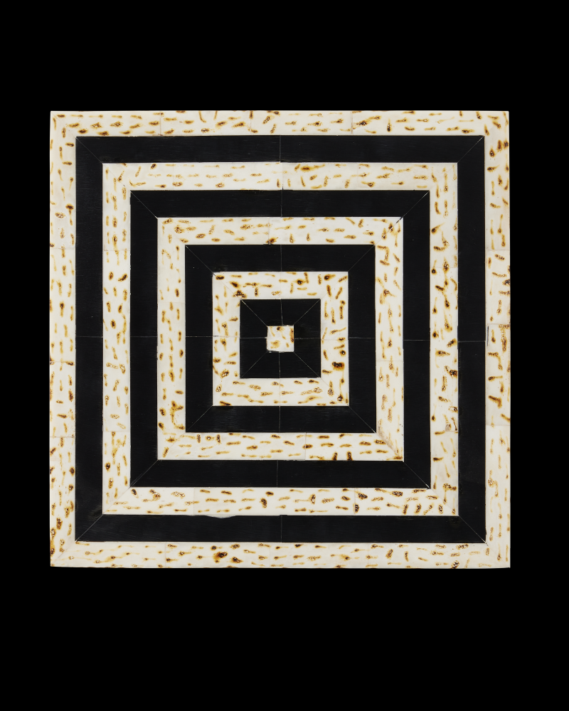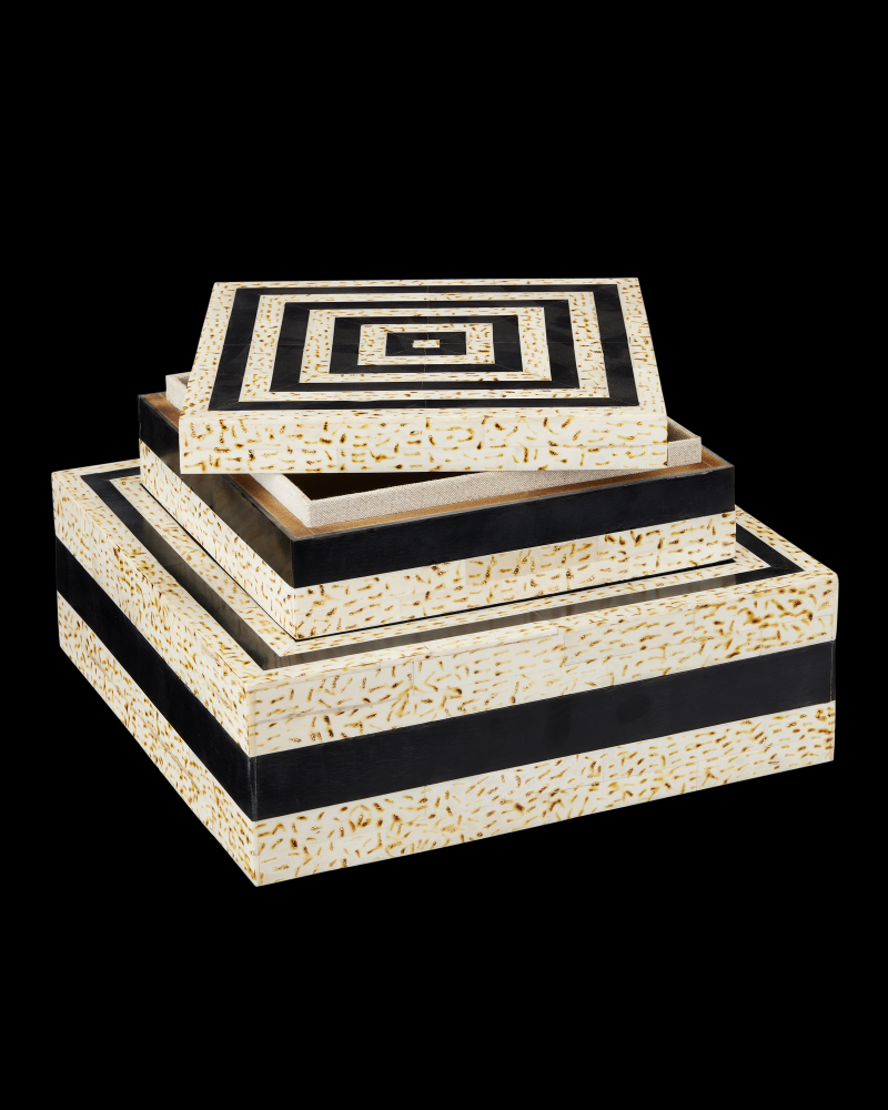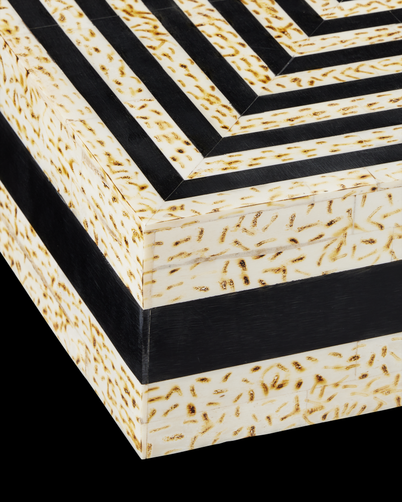 The Taurus Box Set has a number of artisanal aspects to its design and construction, one of which is how the handmade ivory and black decorative boxes have mitered corners that follow the line telescoping from their tops to their bottoms. Once the bone and composite materials have been fitted together in tidy lines, texture is achieved on the surface when artisans mark the white speckled bone with a brazing tool. This level of specificity and the fact that the boxes are composed like intricate puzzles bring complexity to these artisanal accessories.