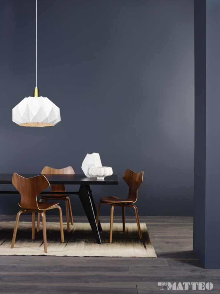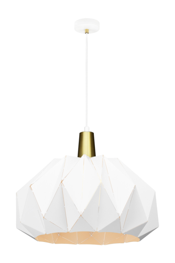 The body design resembles the Japanese traditional paper craft, origami. The lampshade itself consists of 2-dimensional geometric shapes folded together like a fan. The geometric shape used includes a number of different triangles, which creates a look of a 3D visual effect. This fixture is available in two sizes and comes with Brushed Gold accents, a white fabric cord and a white canopy.