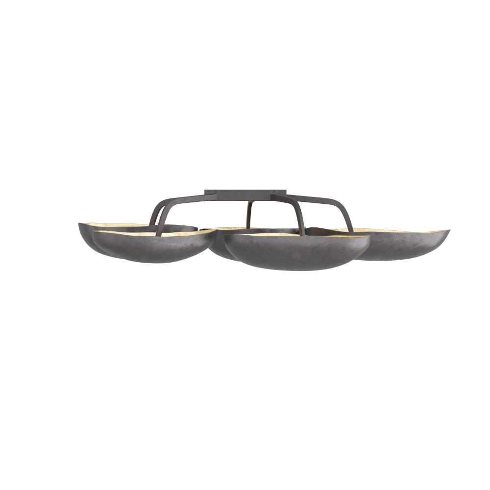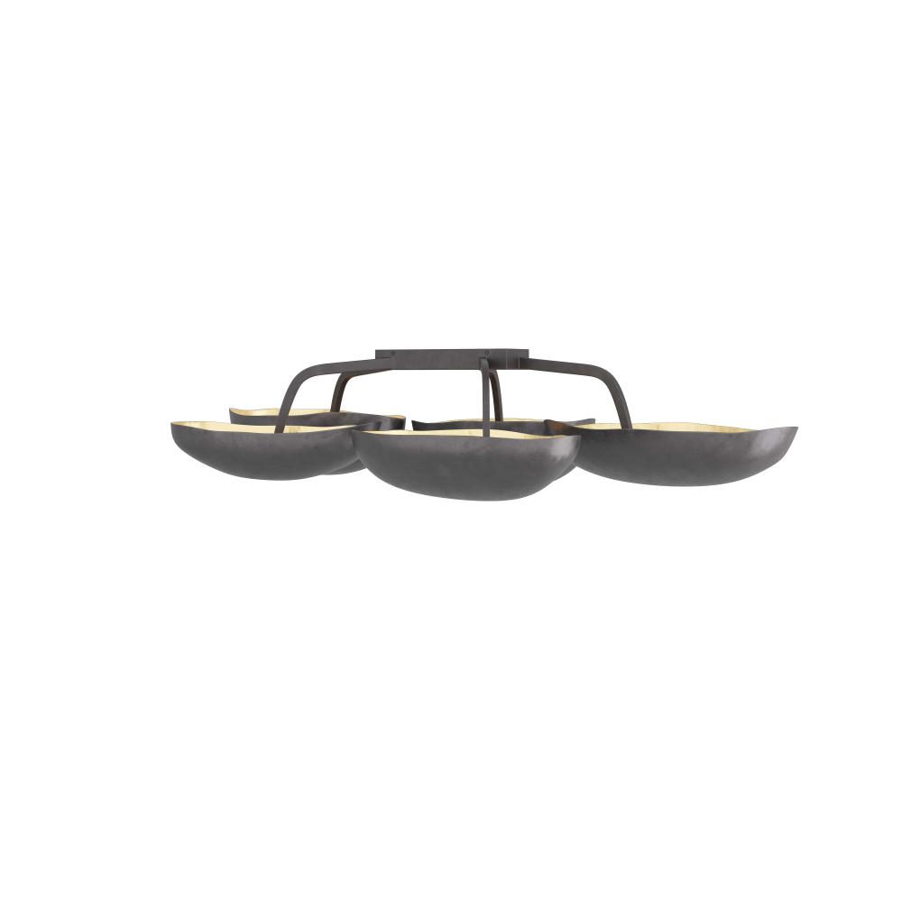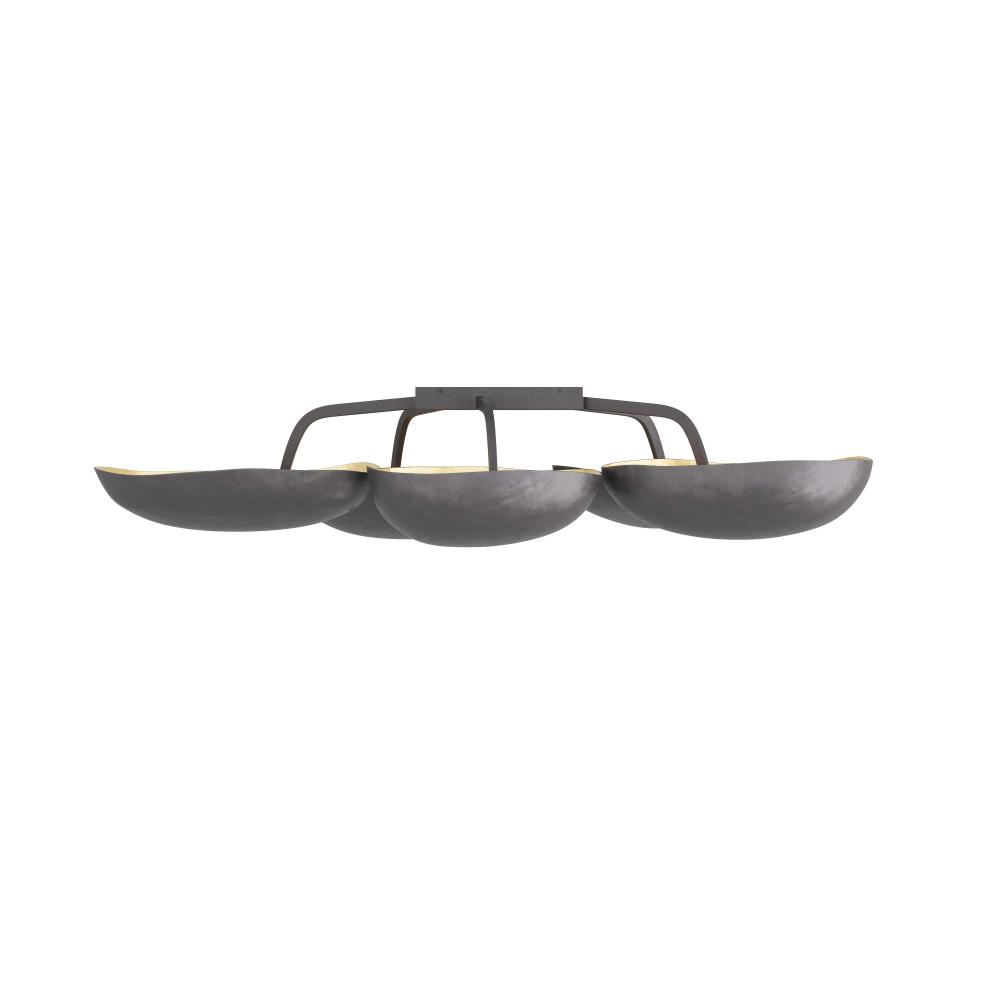 WITH FIVE SCULPTURAL POD-SHAPED SHADES, THE THEO SEMI-FLUSH MOUNT IS A BOLD ACCENT IN ANY SPACE. CREATED IN BLACKENED IRON WITH GOLD-LEAF-LINED INTERIORS, THE LIGHT IS BOTH ORGANIC AND OPULENT. THE LAMP’S INVERTED SHADES ILLUMINATE A ROOM WITH A WARM, UPWARDS GLOW. FINISH WILL VARY.