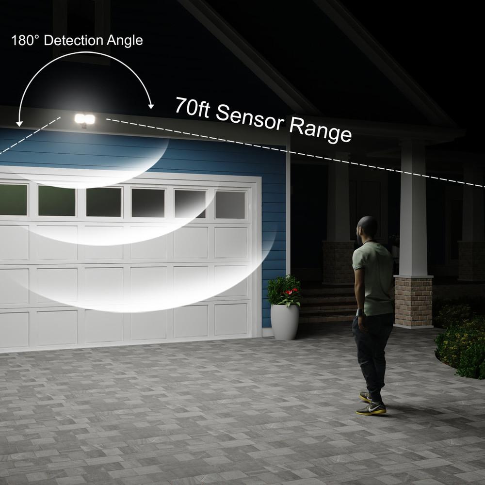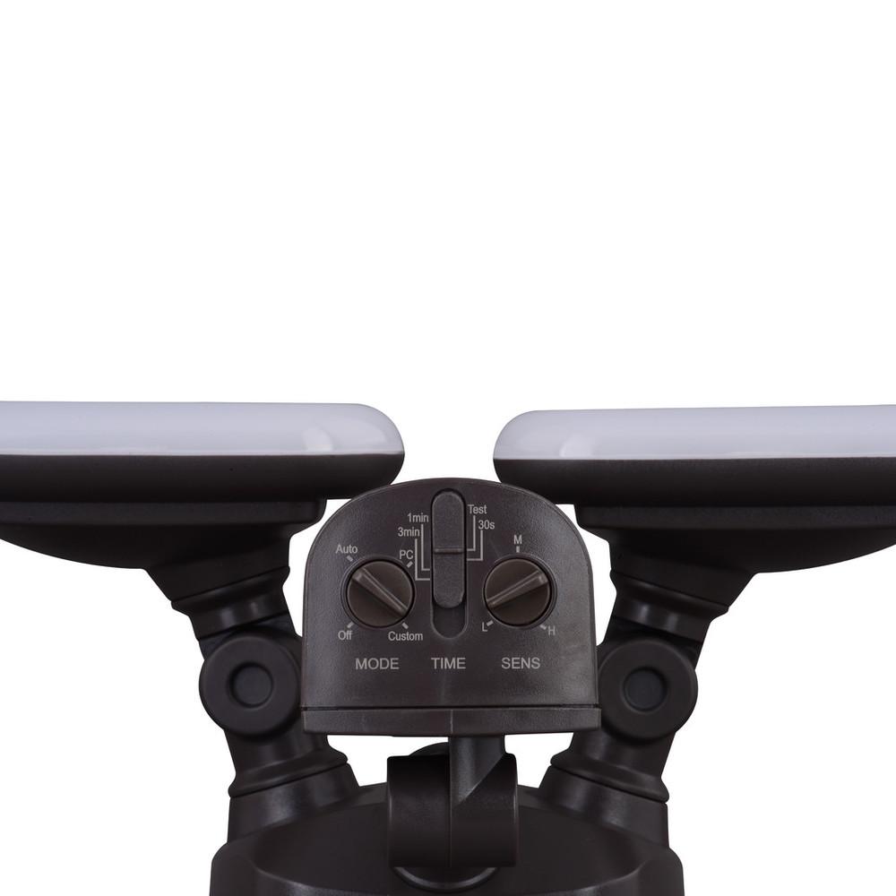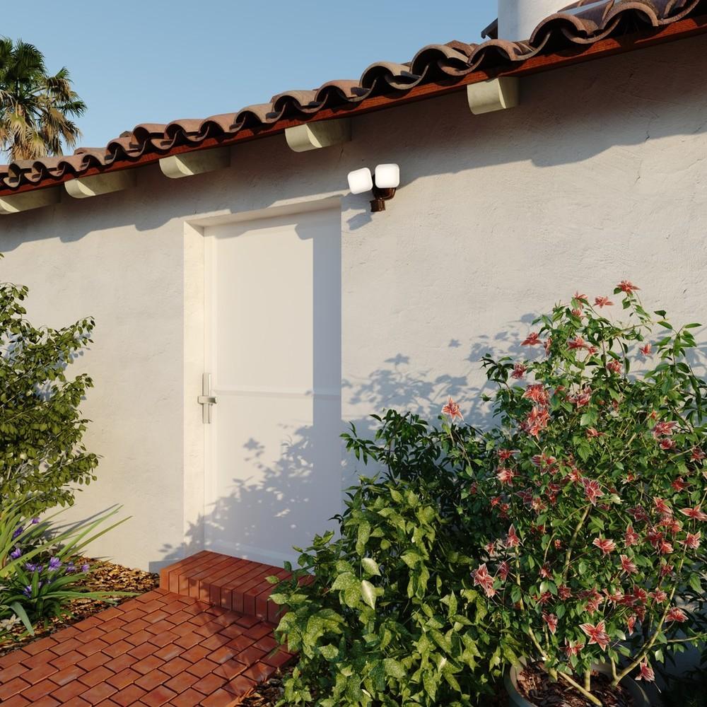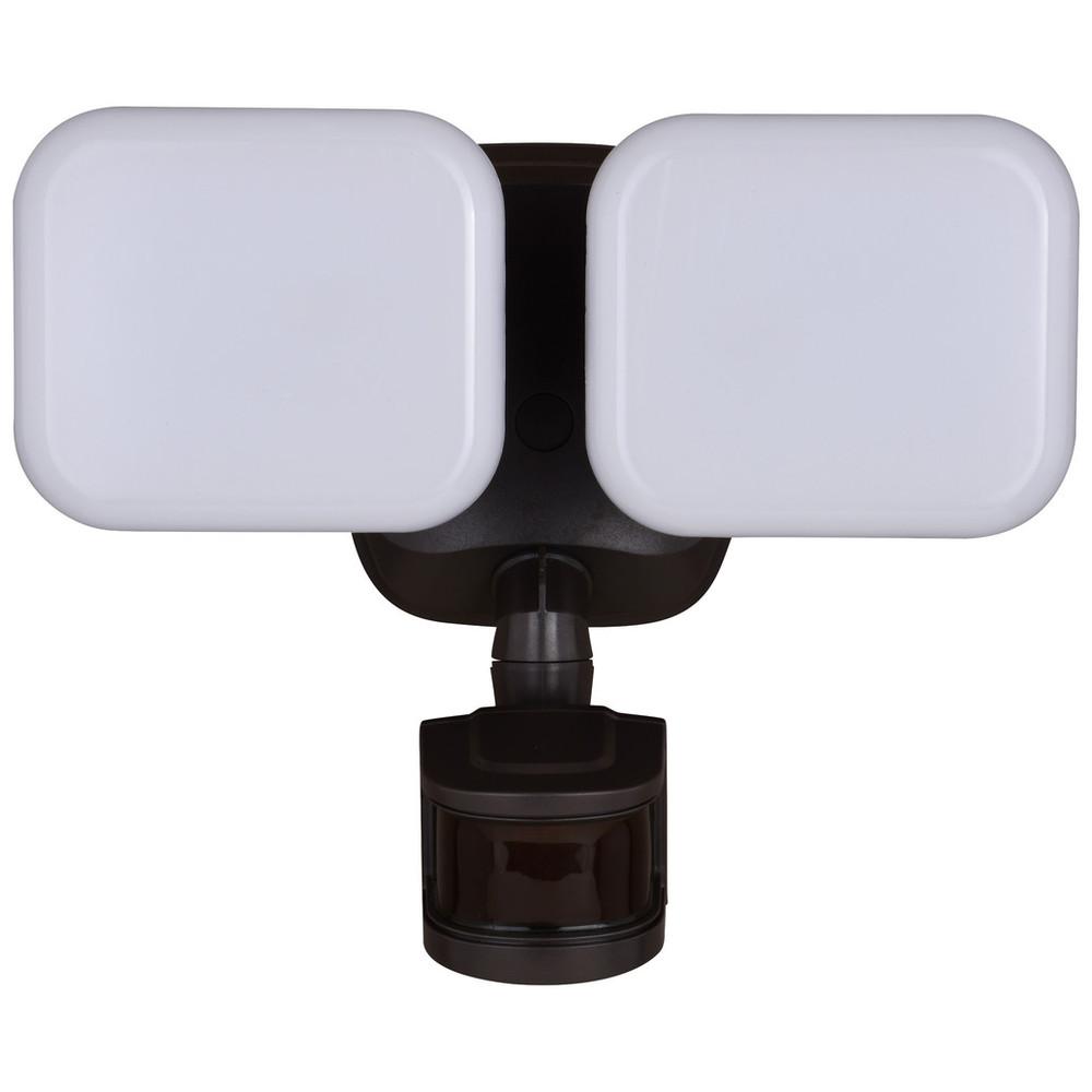 The bronze Theta 2-light LED outdoor motion sensor flood light provides low level 2700K ambient lighting throughout the night and bright 5000K high level when motion is detected. The modern light heads are fully adjustable and deliver 2200 lumens to keep your home's exterior brighter at dusk, dimmer at night, and instantly bright when motion is detected. This dualux security light expands the functionality, safety, and security of your home's outdoor spaces with bright, reliable light when and where it is needed.