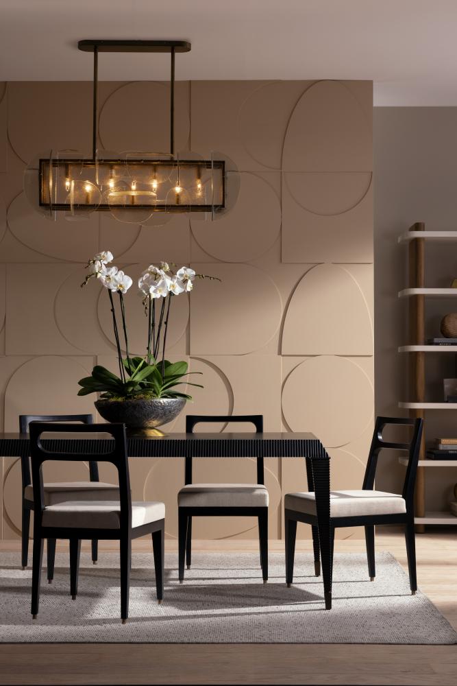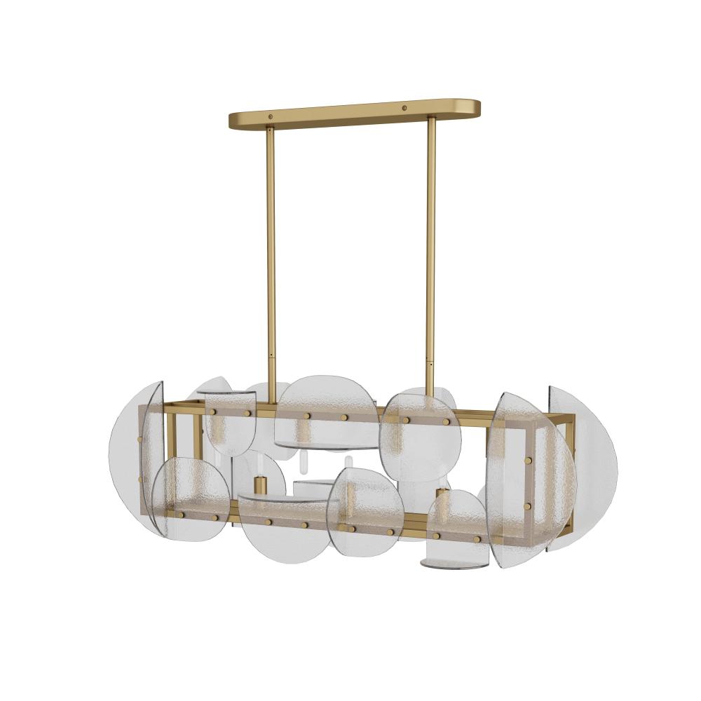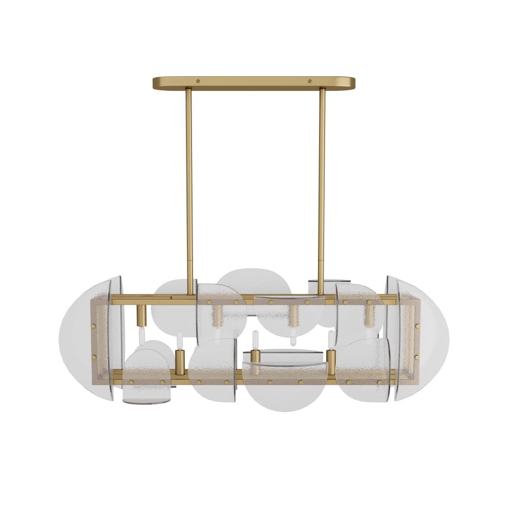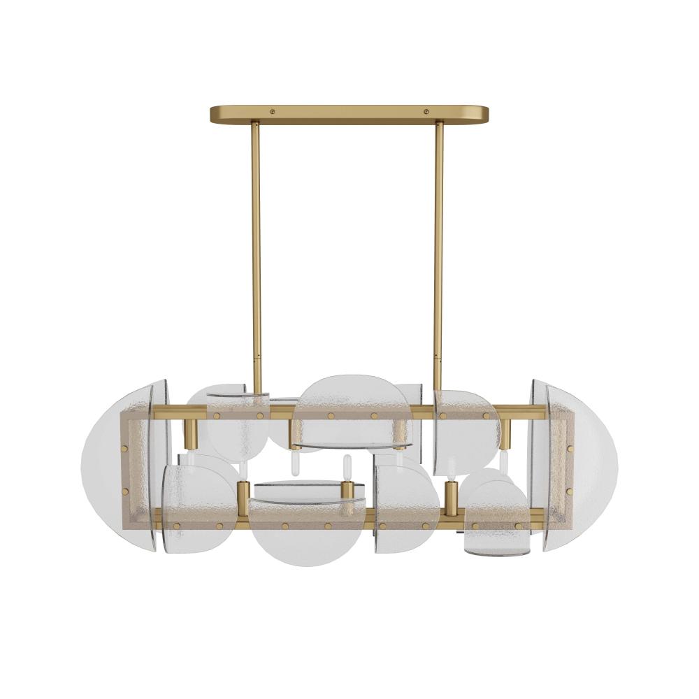 OUR STYLIZED TILLEY CHANDELIER DRESSES UP A SPACE AND HARMONIZES EFFORTLESSLY WITH ANY DESIGN STYLE. THE LINEAR FIXTURE IS CREATED WITH A RECTANGULAR BOX CONSTRUCTION IN ANTIQUE-BRASS FINISHED IRON. CIRCULAR SHAPES OF TEXTURED CLEAR GLASS ARE FOLDED AND AFFIXED AT VARIOUS ANGLES AND PLANES, CASTING LIGHT THAT DANCES AROUND A ROOM. THE PIECE IS FITTED WITH A DUAL PIPE SUSPENSION AND A CAPSULE-SHAPED CANOPY IN ANTIQUE BRASS. DAMP-RATED, ALTHOUGH LIMITED COVERED OUTDOOR CONDITIONS MAY AFFECT FINISH.