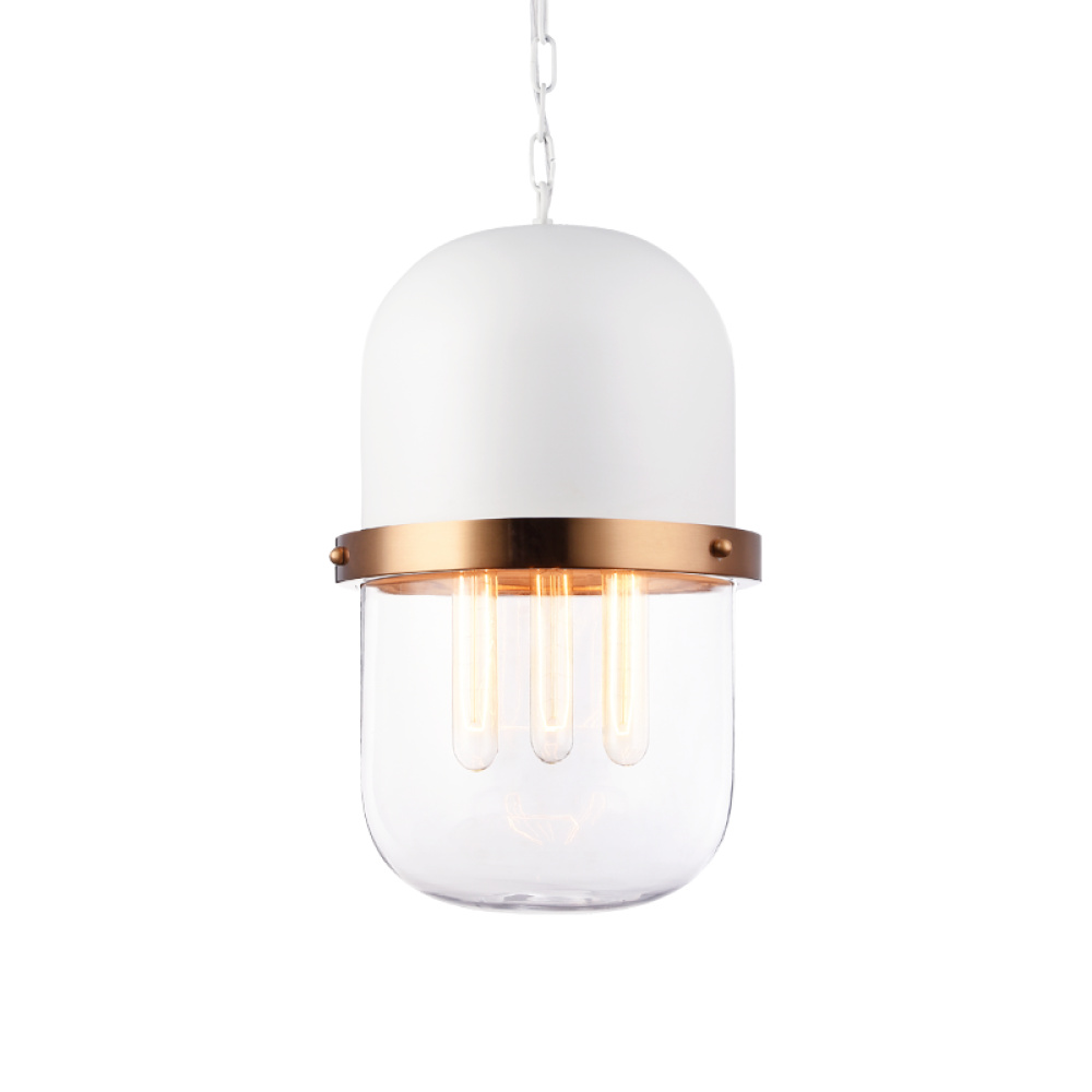 The Tillie series are stylish capsule inspired pendants. Comes in a White and Matte Black finish with Aged Gold Brass detailing that connects the Clear Glass or Opal Glass bottom.These versatile pendants are suitable for all spaces. Available in 2 sizes.