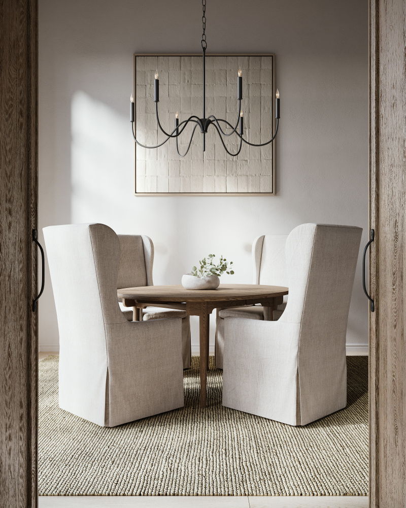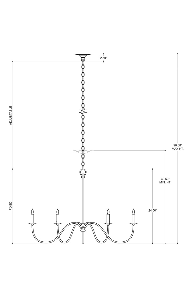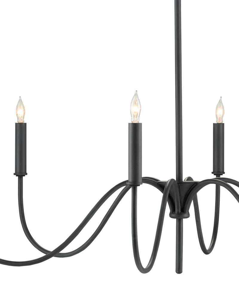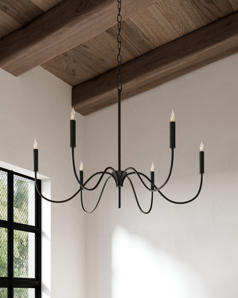 A nod to Early American style, the Tirrell Small Chandelier has graceful arms that arc upward to hold its candle sleeves with simple dignity. The black chandelier is made of wrought iron in an antique black finish. Adjustable from 30.5" to 98.5" with use of included chain/rod kit/cable. If your space calls for a longer drop, additional chain/rods/cable is available for purchase.
