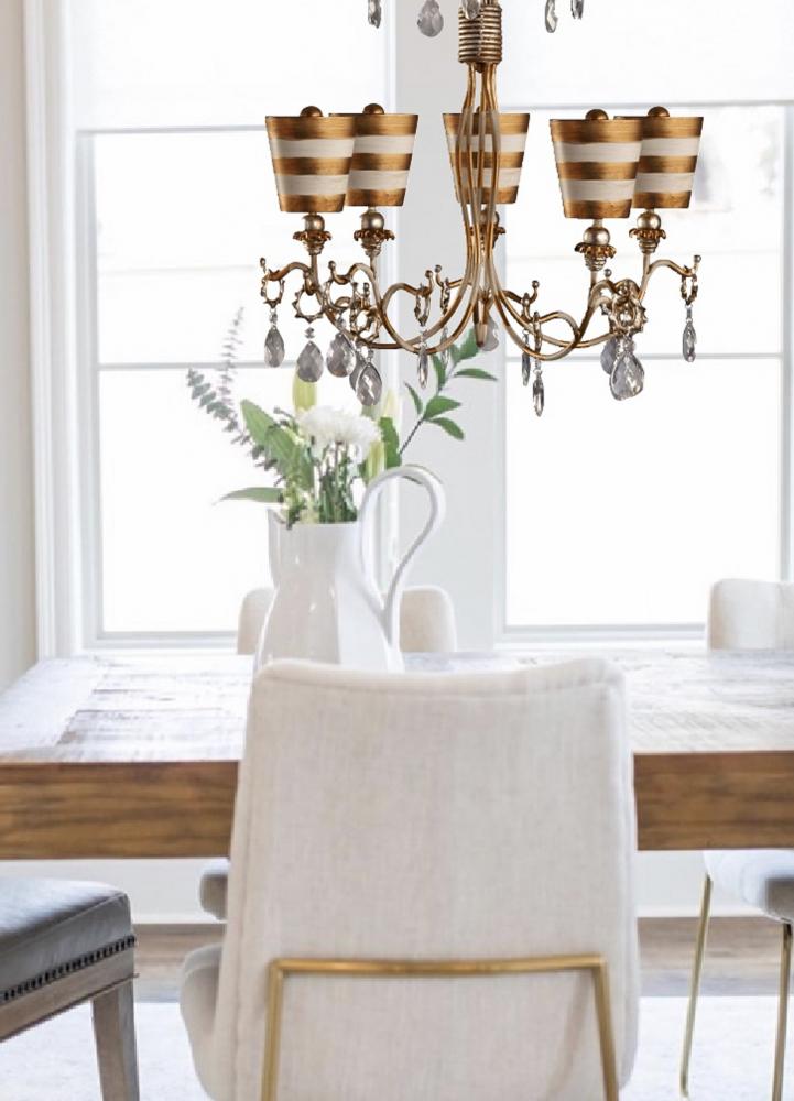 Crafted from sculpted resin and hand painted striped metal , this eclectic 5-light chandelier makes for a fantastic addition to your living or kitchen area. The upside down shades, golden striped design, and unique dangling crystal and resin accents give a glamourous unique look with a classic New Orleans charm. Designed to accommodate five Candelabra bulbs (not included), it is dimmable when connected to a standard dimmer. Your fun side will show through in your decor with this charming chandelier