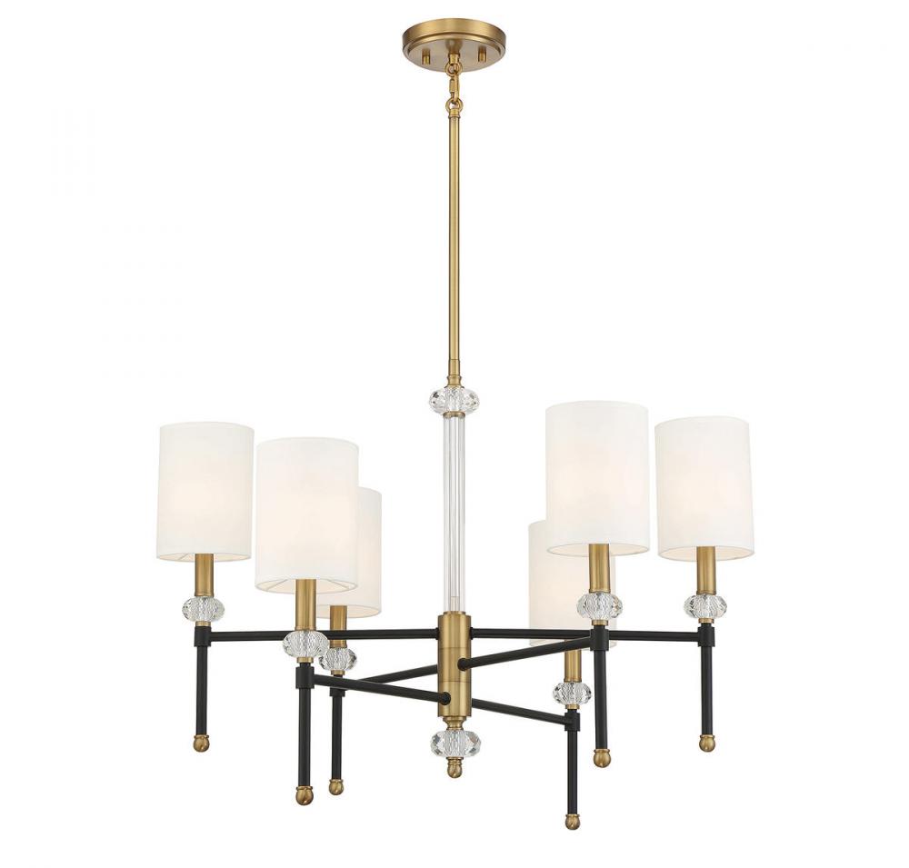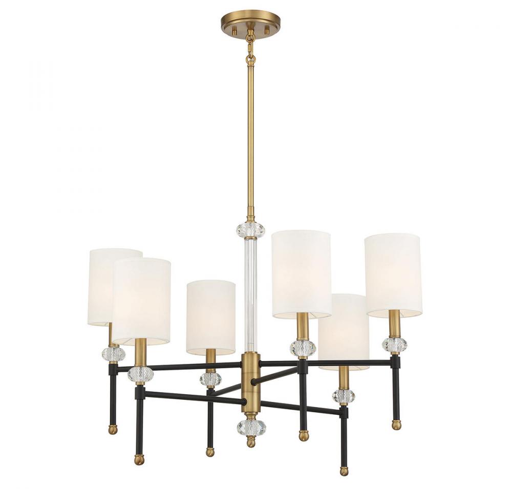 The Savoy House Tivoli 6-light chandelier has a whimsical yet glamorous look that is truly perfect for today's homes. Three adjustable arms each hold two lights topped with white fabric shades and decorated with faceted crystal baubles. Finished in a beautiful two-tone matte black with warm brass accents. Tivoli is 28" in diameter and has an adjustable height ranging from 26" to 72". It uses six candelabra size bulbs of up to 60 watts per bulb. Comes with four 12" downrods and one 6" downrod, plus 80" of cord.