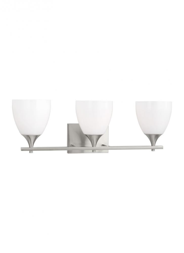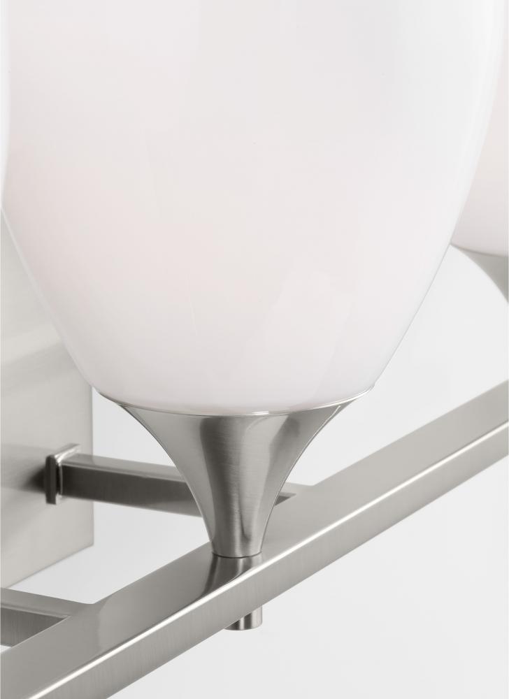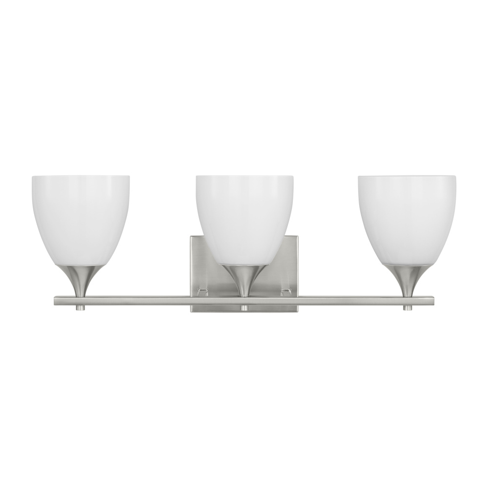 Made to coordinate across a broader range of bath hardware and design styles, this light breathes new life to its traditional shape with milk glass shades and striking, modern finishes