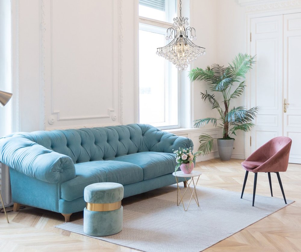 Flared shape and curved steel arms, frame, and chain in a chrome finish