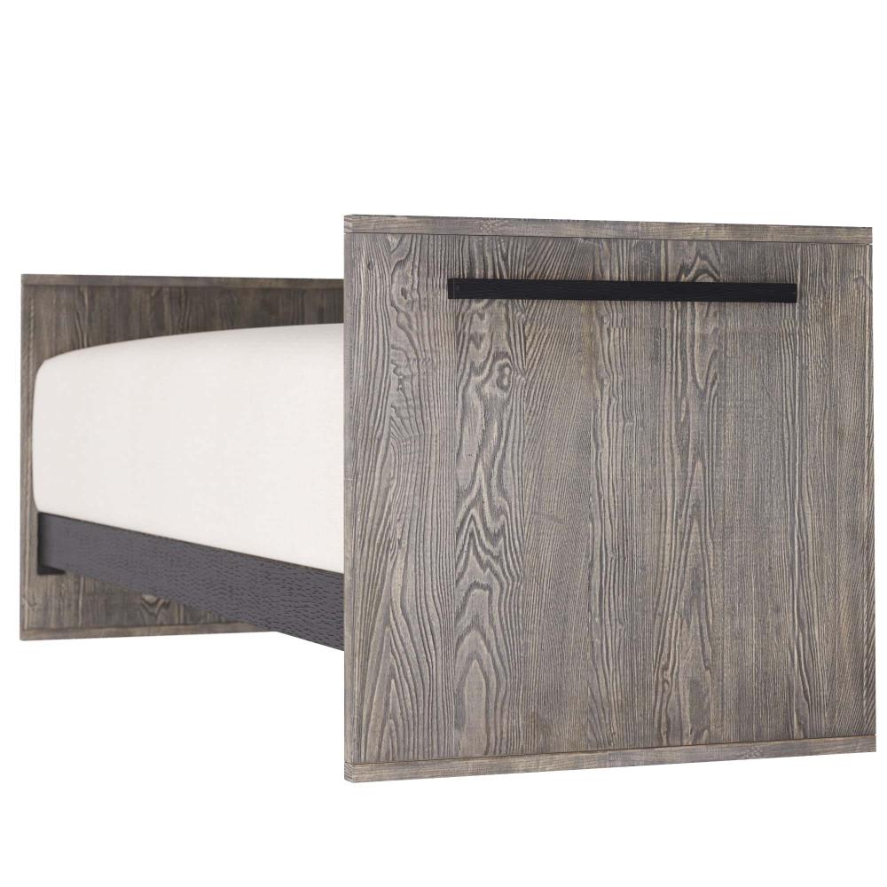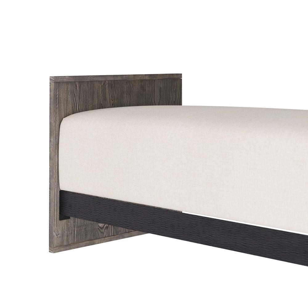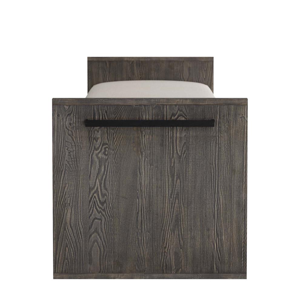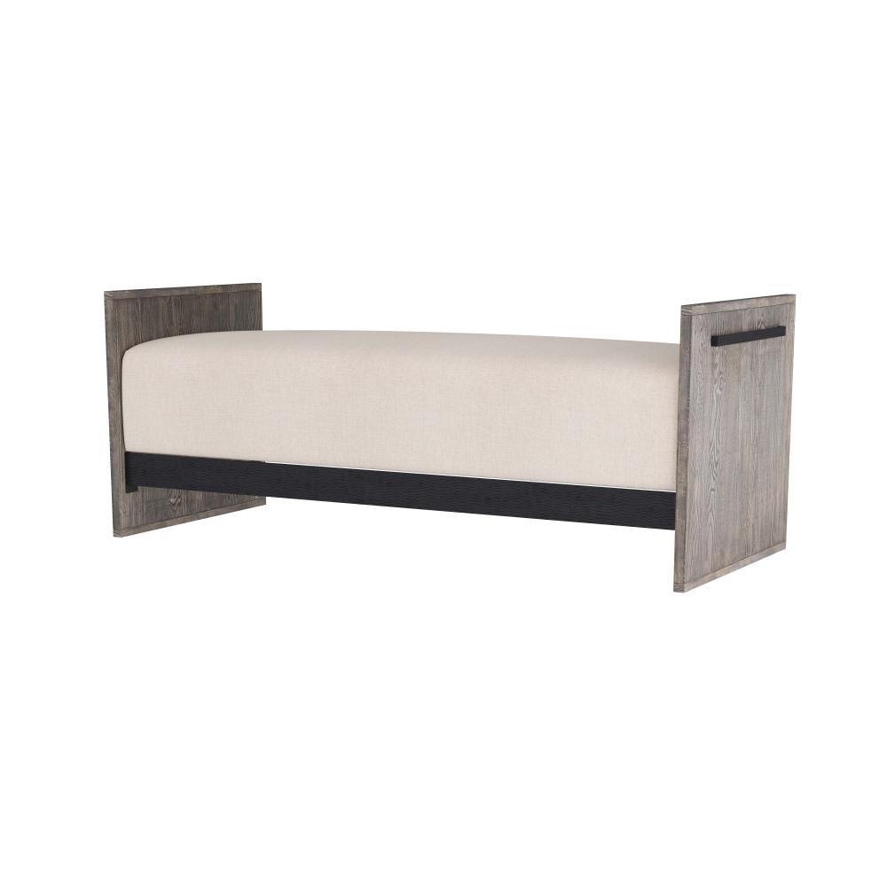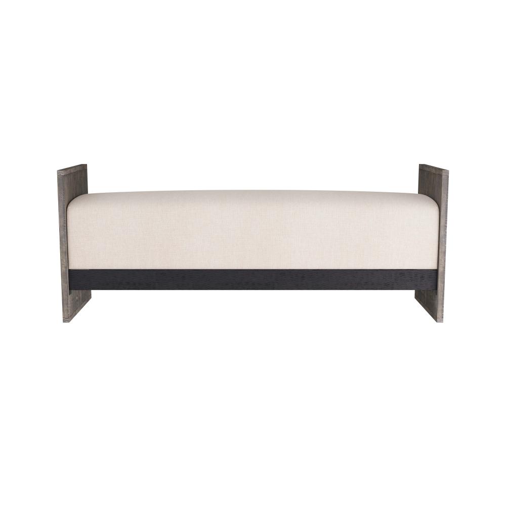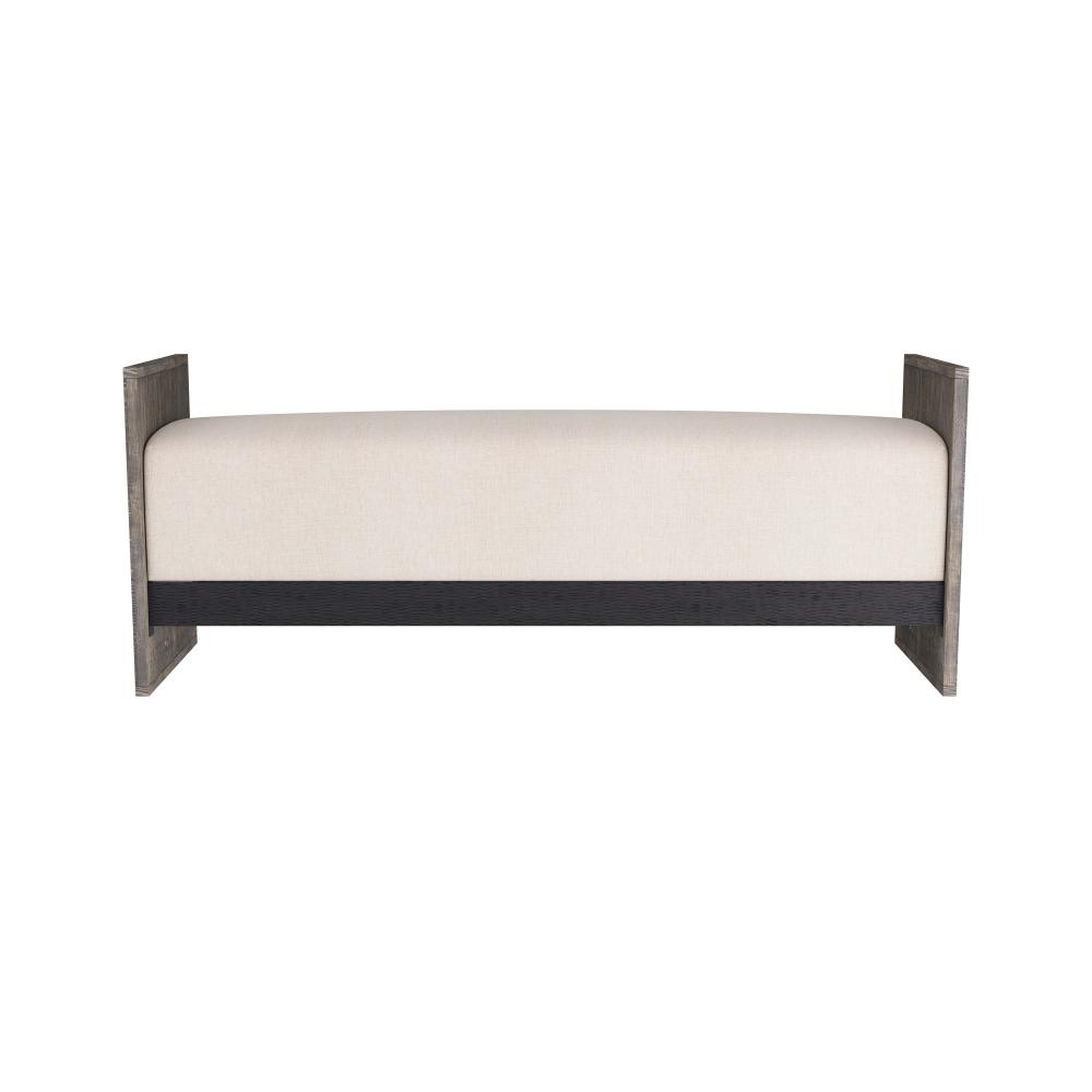 OUR TOWNSEND BENCH IS CRAFTED IN A SIMPLE, PLANAR CONSTRUCTION, IN GRAY WASHED OAK WITH DECORATIVE HANDLES MADE FROM HAMMERED NATURAL IRON AND A NATURAL LINEN CUSHION WITH A THICK APRON. ITS OVERSIZED SCALE MAKES IT AN EASY SWAP FOR A SETTEE. FINISH WILL VARY.