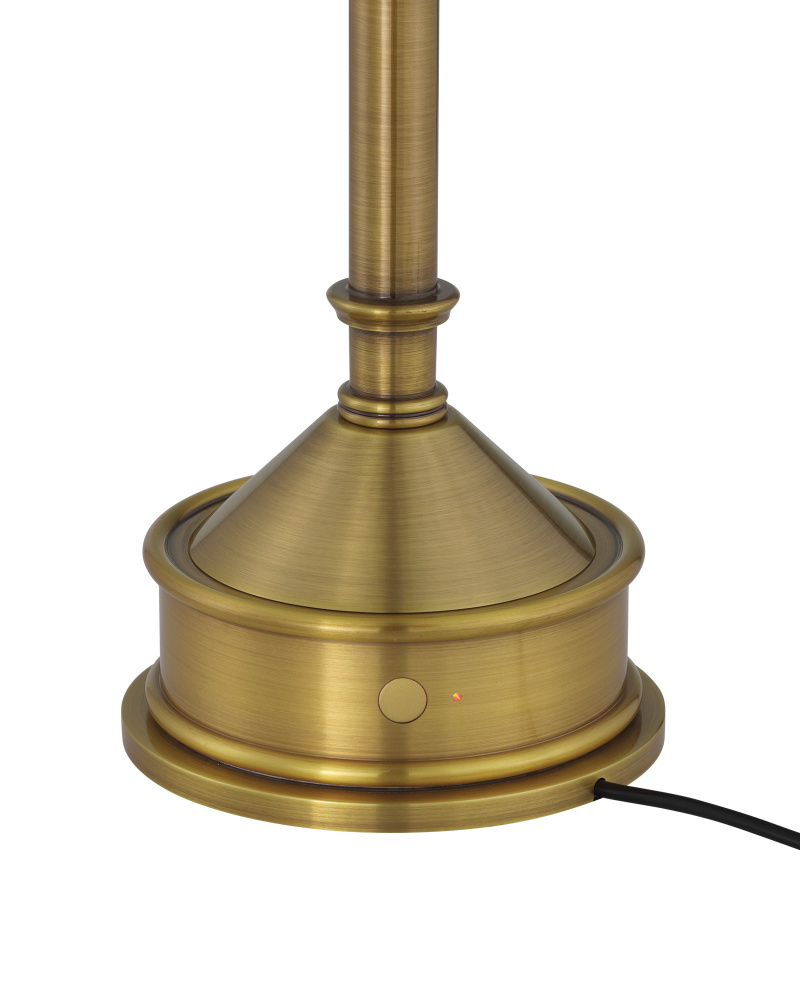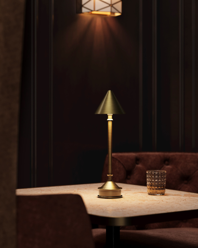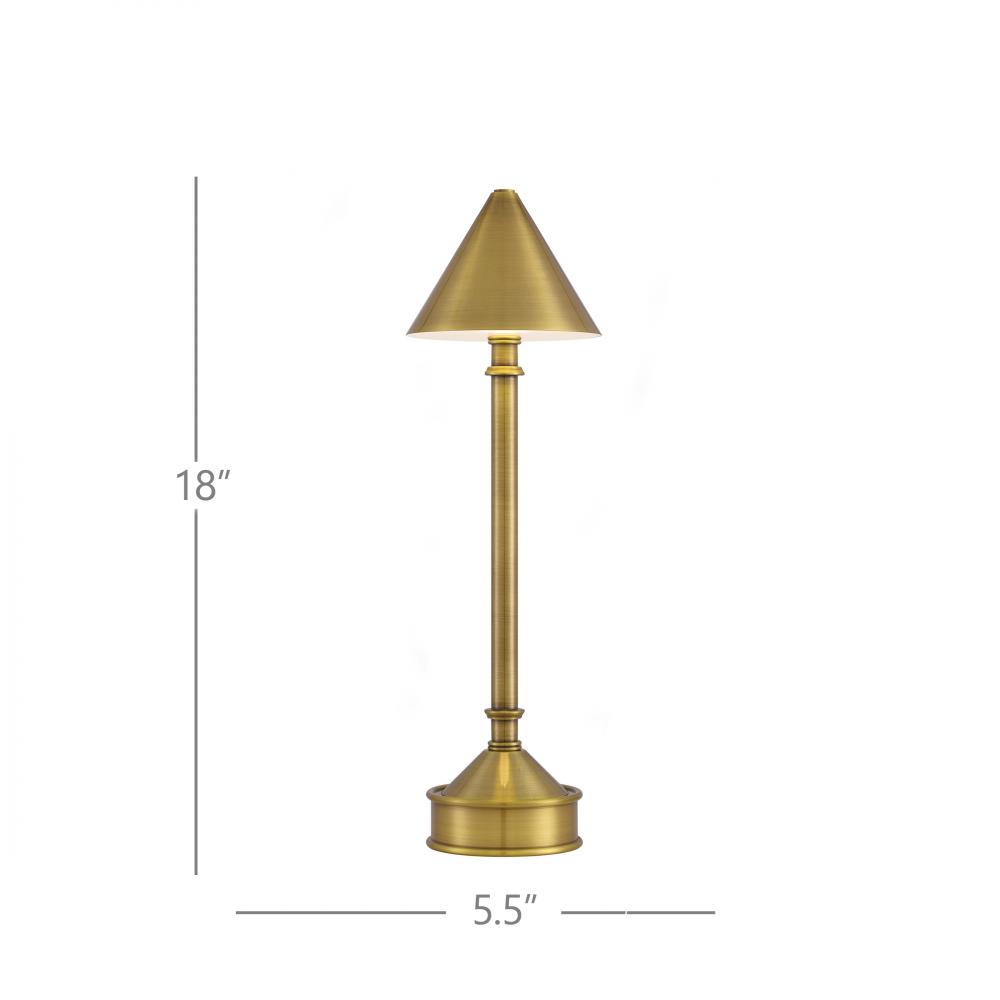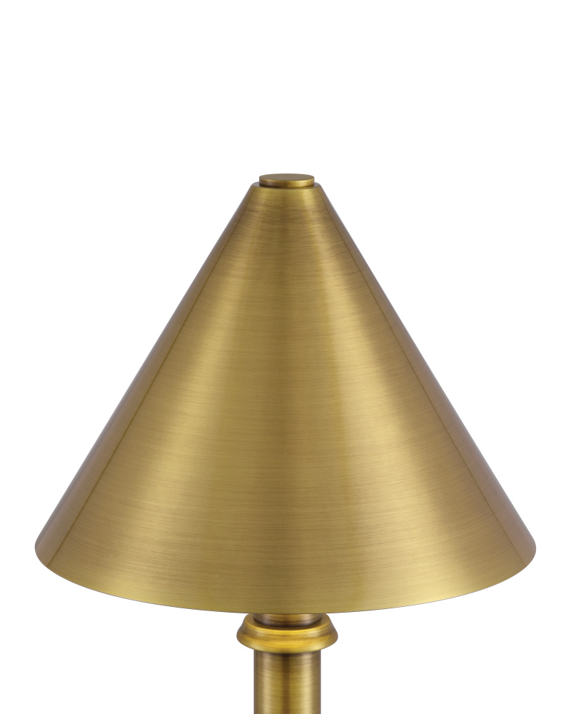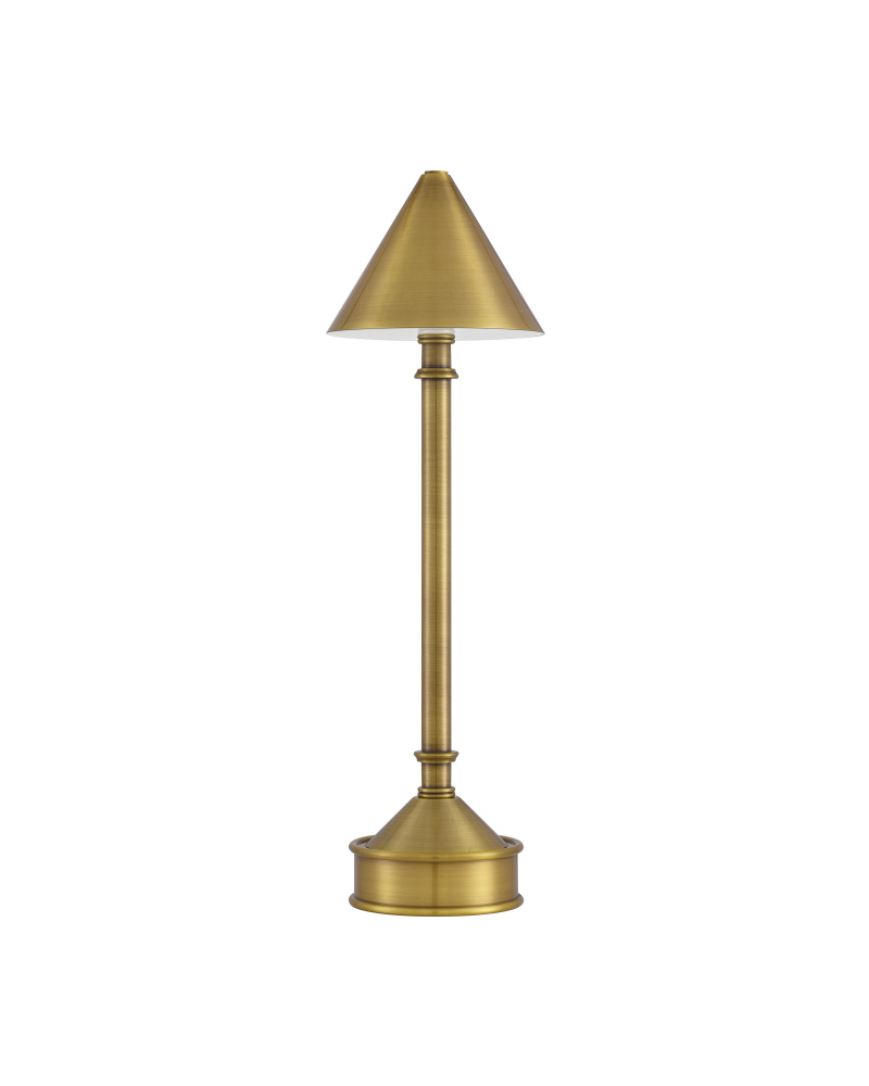 The Traipse Brass Cordless Table Lamp is a gold lamp that has a way of getting around. The metal lamp in a polished brass finish is petite in size, and its base holds the on/off switch. The matching metal shade has a diffuser on the bottom. to recharge, simply place the the lamp on its separate charging pad.