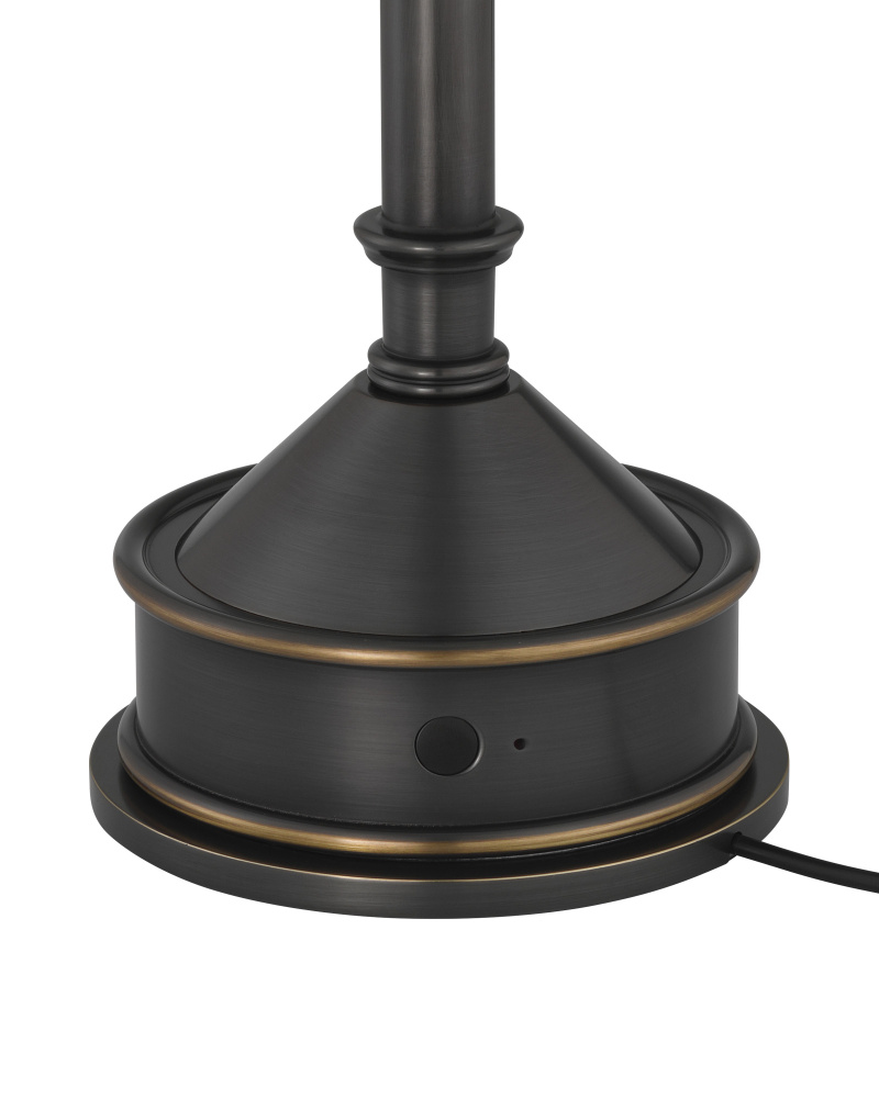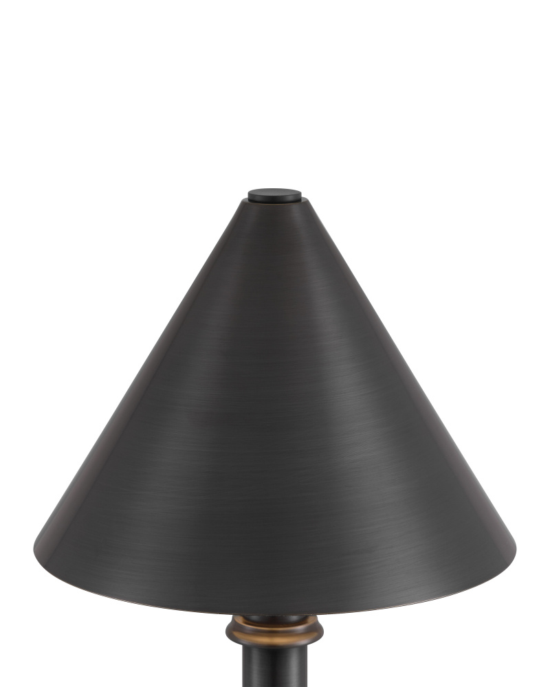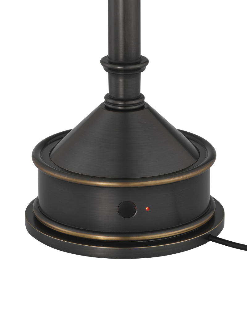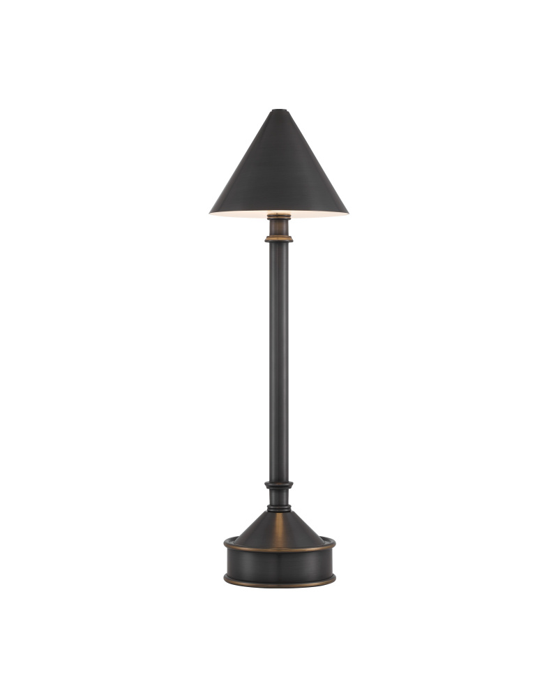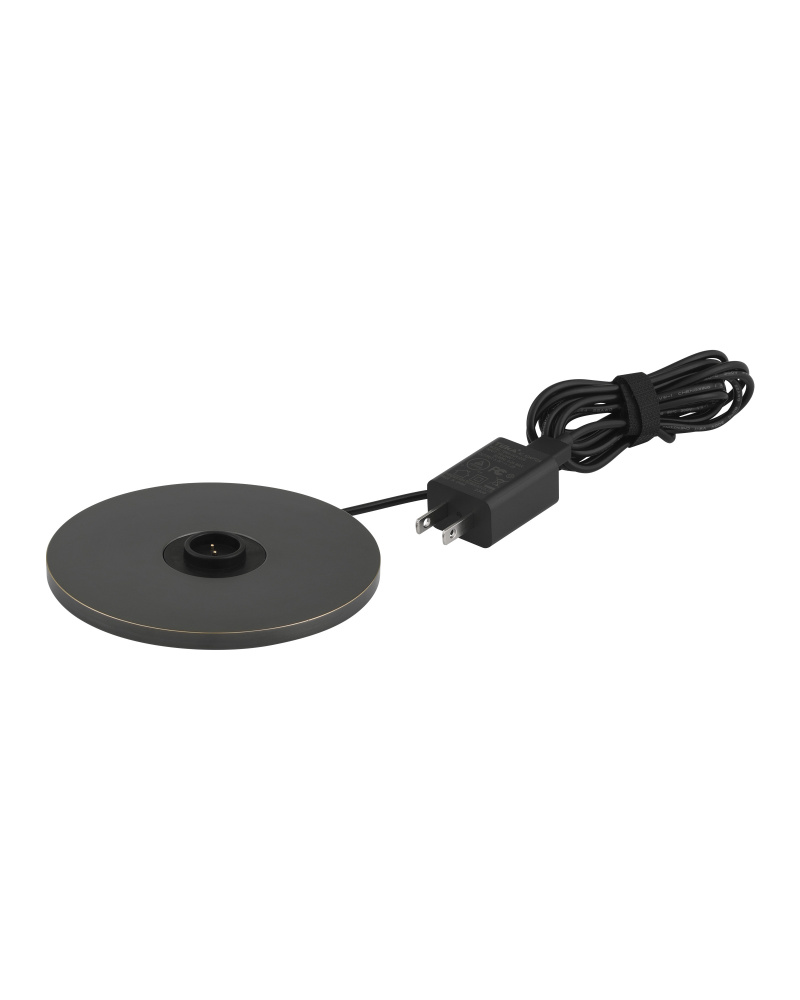 The Traipse Bronze Cordless Table Lamp is a black lamp that has a way of getting around. The metal lamp in an oil-rubbed bronze finish is petite in size, and its base holds the on/off switch. The matching metal shade has a diffuser on the bottom. to recharge, simply place the lamp on its separate charging pad.