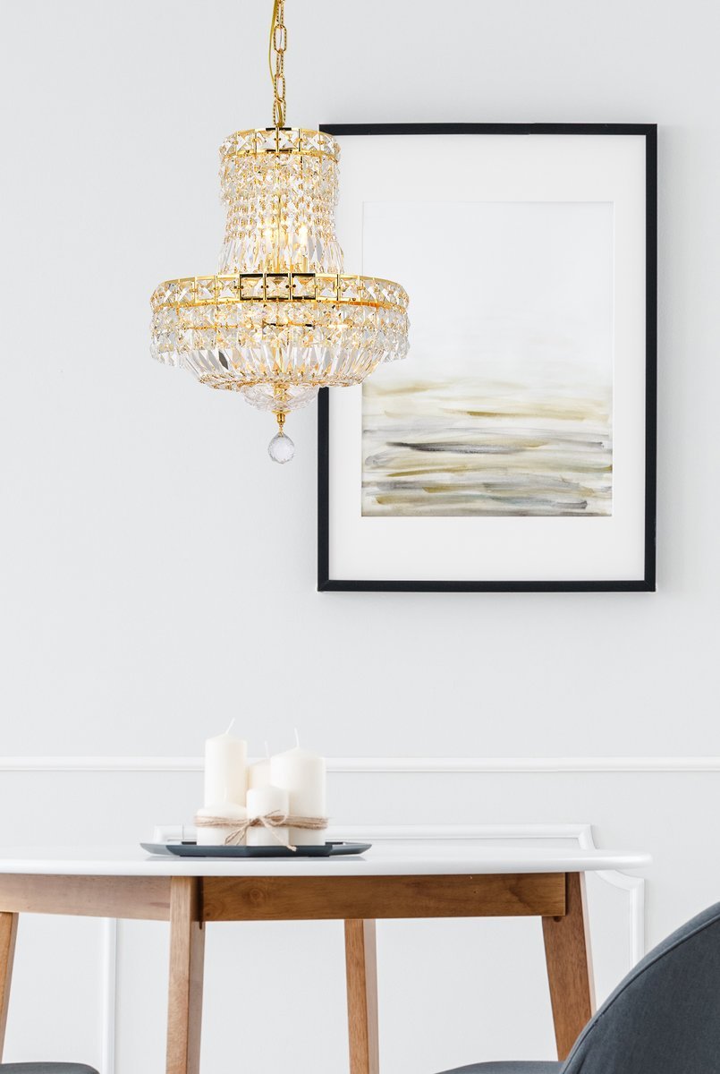 The Tranquil collection of hanging fixtures is everything you could imagine in the most decadent of lighting for your home. Captivating and serene, the radiance of this masterpiece will make you feel like a waterfall of lustrous sparkle enraptures you. Gold-finished bands of exquisite emerald-cut and baguette crystals are finished off with a mesmerizing spherical gem. These hypnotizing chandeliers and hanging pendants will add a touch of panache to your kitchen, dining room, foyer, or bedroom.
