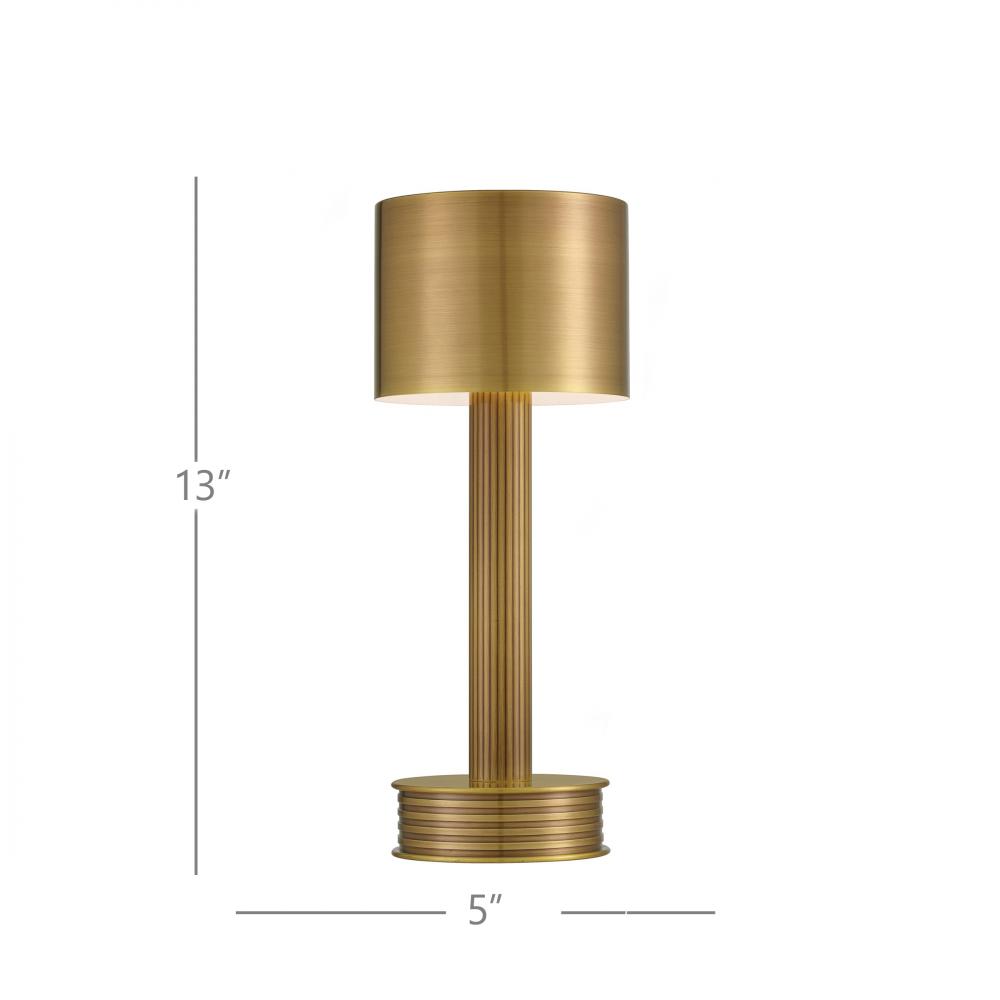 The Traverse Brass Cordless Table Lamp is a gold lamp that moves around easily. The metal lamp in a polished brass finish is petite in size, and its base holds the on/off switch. The matching metal shade has the same brilliant sheen as the rest of it. to recharge, simply place the lamp on its separate charging pad.