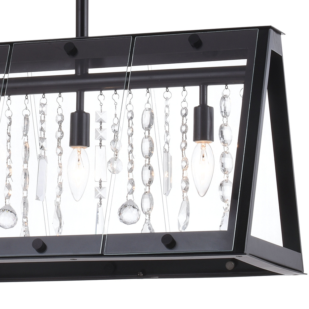 A touch of glam balanced with strong edgy geometric lines bring the Tremont collection’s urban loft aesthetic into your space. Crystal strands add a glamourous tone to the tapered clear glass and dark metal surround. Removable glass panels allow you to change the look and eliminate the need to clean glass. Combine that with vintage Edison style filament bulbs to complete the look. The linear footprint of this chandelier will complement oval or rectangle dining room tables and is ideal for kitchen islands, dining areas, or bar areas.