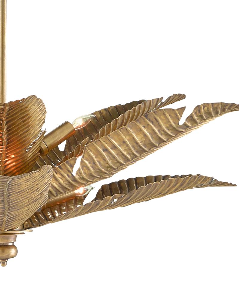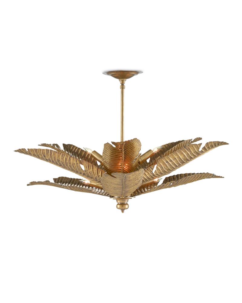 The Tropical Semi-Flush is made of brass in a vintage brass finish with life-like leaves attached to the long stem to imply movement. This detail gives the gold semi-flush extra sophistication.