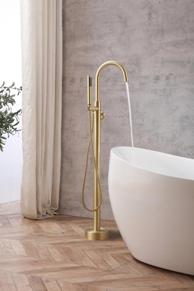 Our floor-mounted bathtub faucet brings a touch of space-saving elegance to your bathroom.