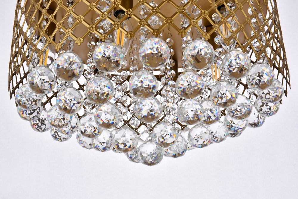 Enjoy the shimmering beauty of the Tully flush mount in a brass finish. The elegant lattice metal curtain allows for the hanging crystals to play and dance around the illuminating light, with larger crystals at the base peeking out to say hello. Lights on or off, this flush mount will surely make quite a statement in your home!
