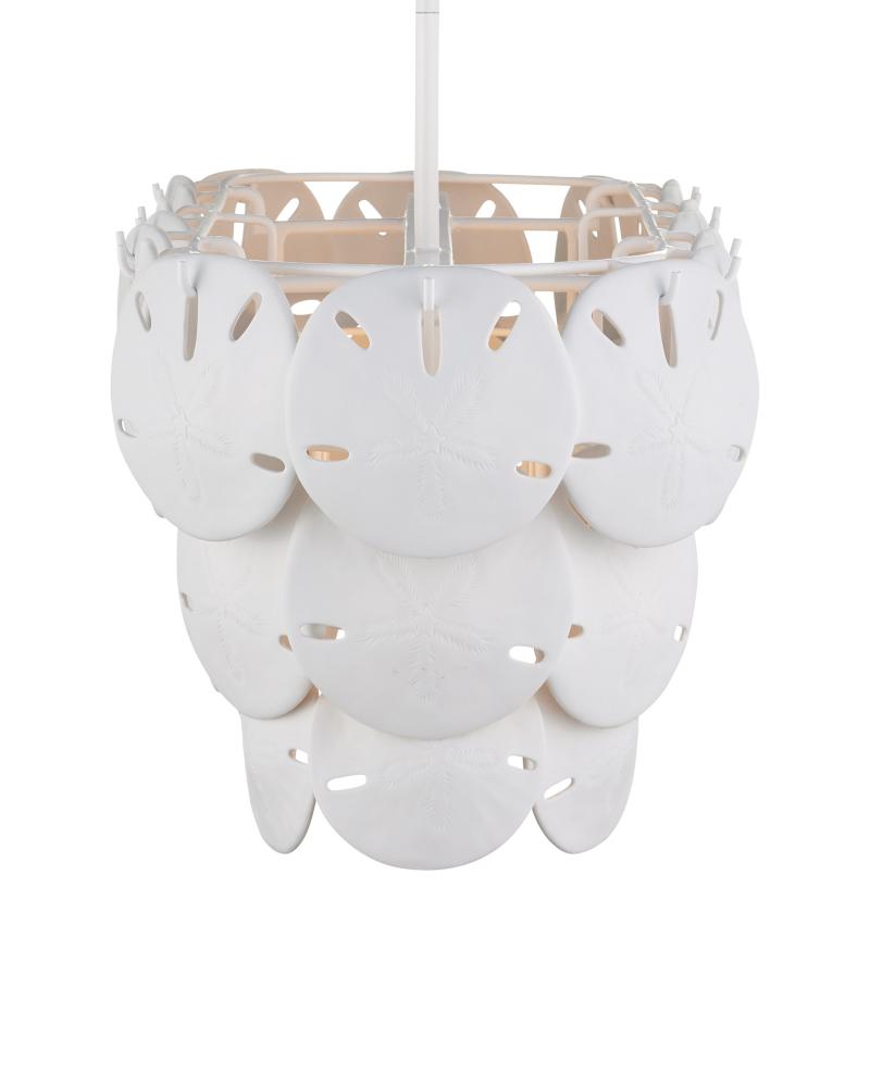 Marjorie Skouras designed the Tulum Oval Chandelier, inspired by the tropical beauty of the Yucatan Peninsula where she lives. This is an elegantly delicate design, as the sand dollars are cast in semi-translucent bone China and they make a pretty sound when a strong breeze ruffles them. There are three sizes of removable sand dollars on this design, which makes it easy to clean. The sugar white finish on the hardware complements the pale discs on this nature-inspired chandelier, making it apropos for rooms overlooking the ocean. Adjustable from 17.5" to 59.5" with use of included chain/rod kit/cable. If your space calls for a longer drop, additional chain/rods/cable is available for purchase.