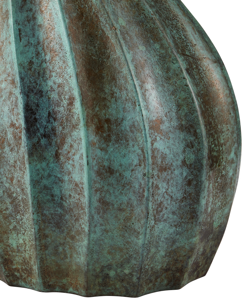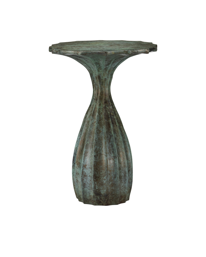 The Tunis Accent Table is made of cast aluminum in a faux verdigris finish. There is a touch of sheen on the mottled surfaces that flow around it and extend up to its top. The artisanal hand of the craftsman who makes this is evident in the strong variations in the placement of the different tones, accentuated by the peaks and valleys.