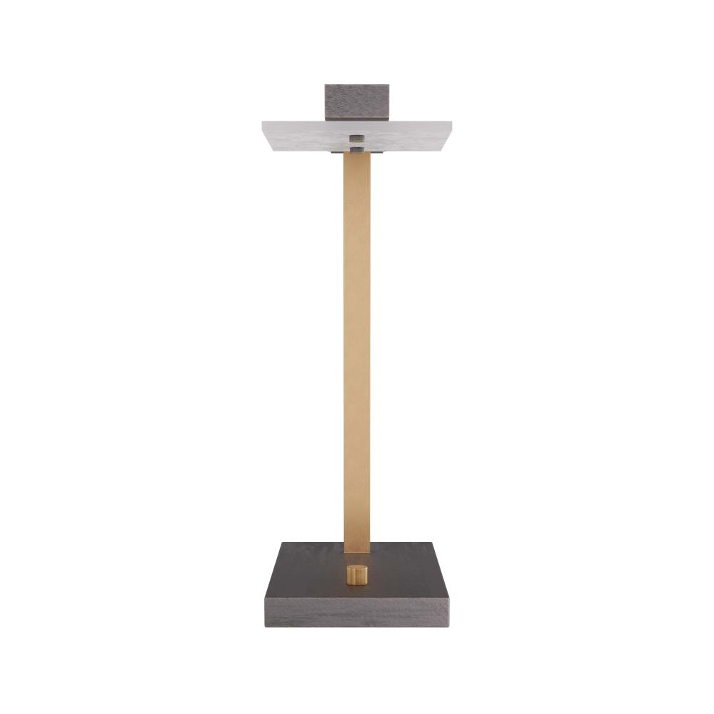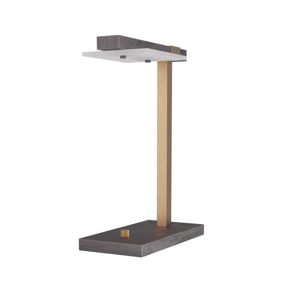 THE TWAIN TABLE LAMP IS AN EXAMPLE OF MASTERFUL MATERIAL MIXING AND EXQUISITE DETAILING. THIS SLEEK, MODERN LED DESK LAMP IS CREATED IN A L-SHAPE SILHOUETTE, WITH A CHATTERED ANTIQUE BRASS STEM AND CONTRASTING ENGLISH BRONZE AS THE FINISH ON THE BASE. A PLATE OF WHITE ALABASTER FORMS A DIFFUSER, CASTING SOFT SURFACE ILLUMINATION. THE KNURLED, ANTIQUE BRASS DIMMER KNOB RESTS ATOP THE BASE, ADDING EMBELLISHMENT AND GRIP. FINISH WILL VARY.