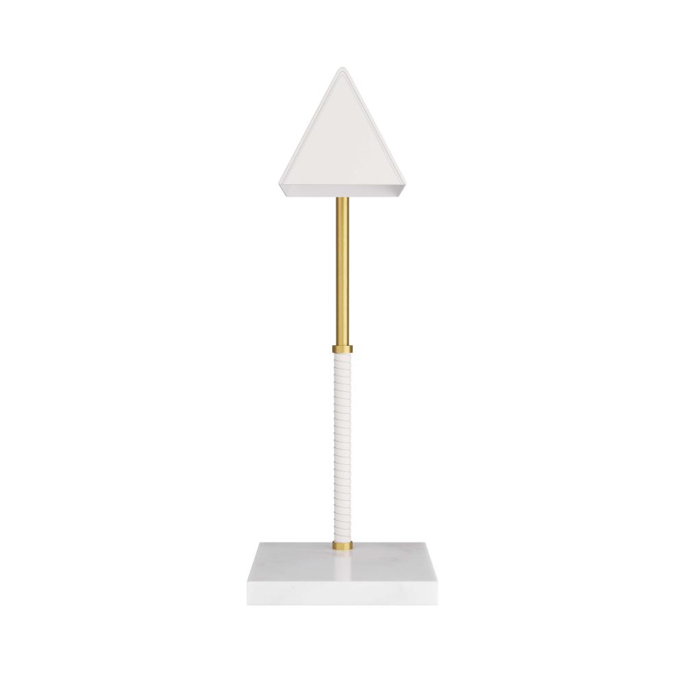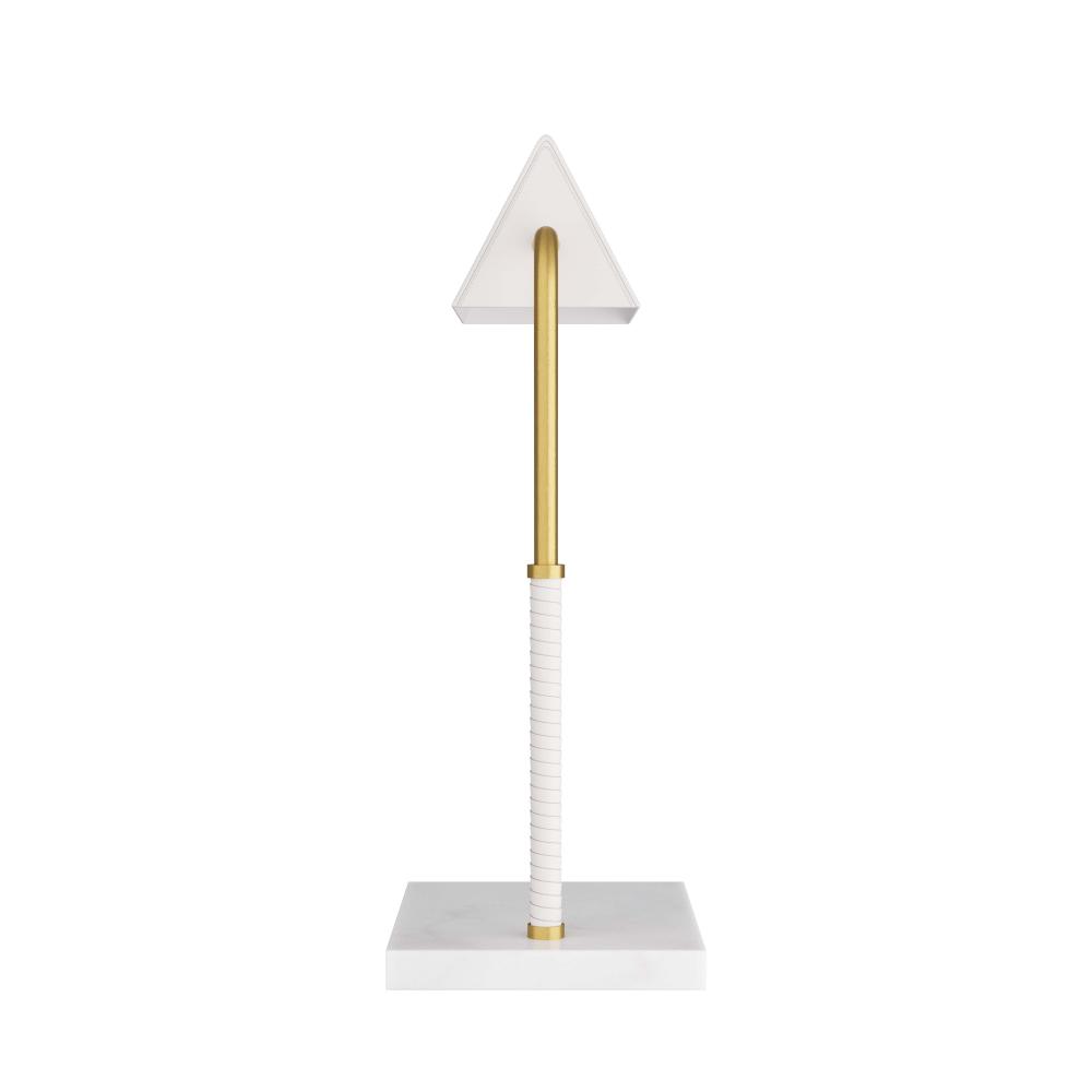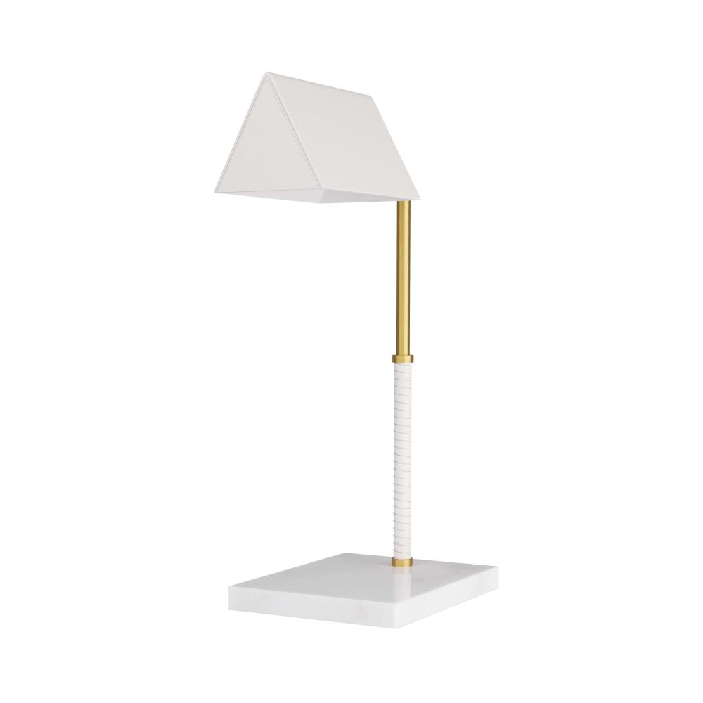OUR PHARMACY-STYLE TYSON TABLE LAMP MAKES A HANDSOME ADDITION IN ANY LIBRARY OR LIVING SPACE. THE TASK LAMP IS CRAFTED WITH A PIVOTING, TRIANGULAR SHADE THAT IS CLAD IN WHITE LEATHER AND LINED IN A WHITE LACQUER FINISH. LEATHER IS FEATURED AGAIN, TIGHTLY WRAPPING THE ANTIQUE BRASS STEEL POST AND THE RECTANGULAR BASE, CREATING TEXTURE AND VISUAL INTEREST. A SLICE OF WHITE MARBLE FORMS THE LAMP’S RECTANGULAR BRASS BASE. FINISH WILL VARY.