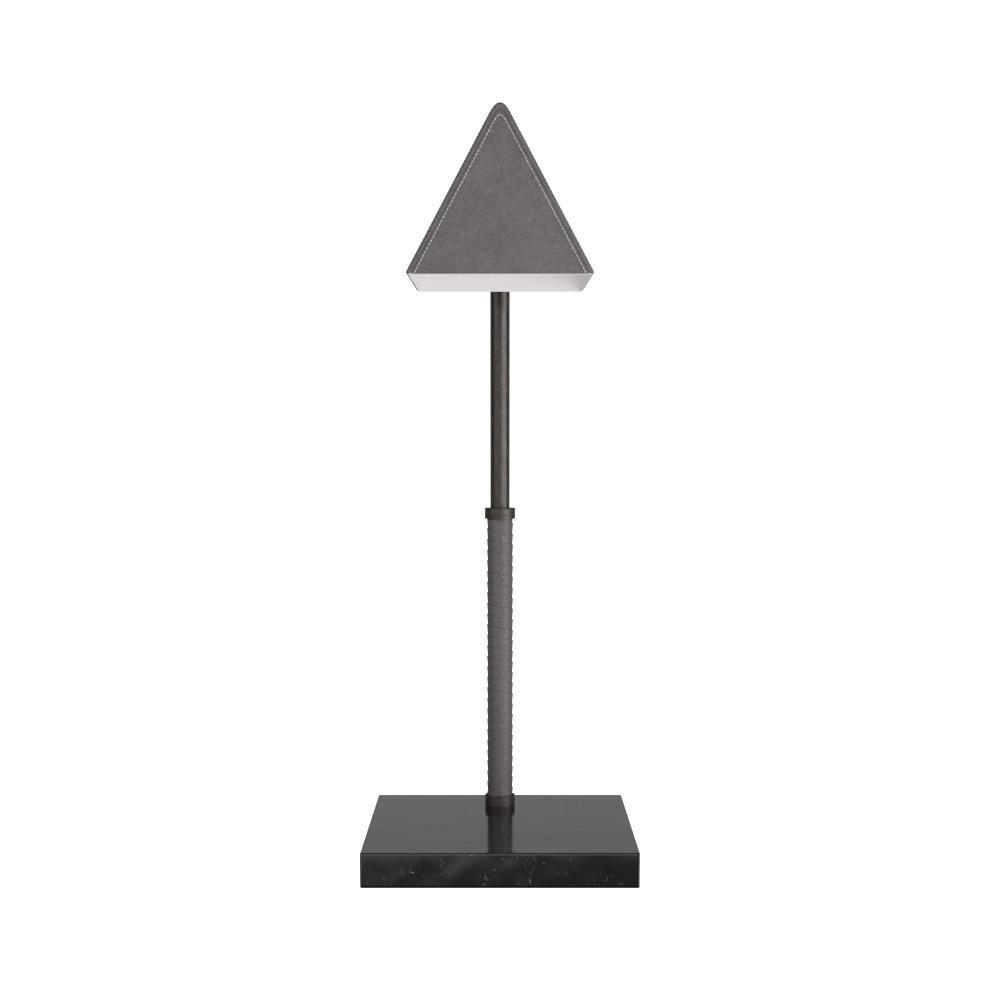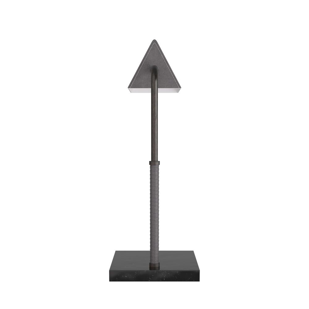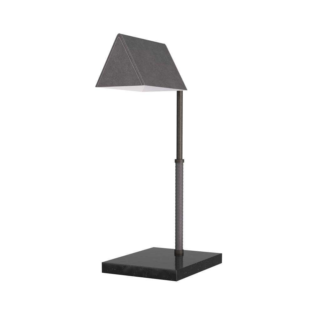 OUR PHARMACY-STYLE TYSON TABLE LAMP MAKES A HANDSOME ADDITION IN ANY LIBRARY OR LIVING SPACE. THE TASK LAMP IS CRAFTED WITH A PIVOTING, TRIANGULAR SHADE THAT IS CLAD IN CHARCOAL LEATHER AND LINED IN A WHITE LACQUER FINISH. LEATHER IS FEATURED AGAIN, TIGHTLY WRAPPING THE ANTIQUE BRASS STEEL POST AND THE RECTANGULAR BASE, CREATING TEXTURE AND VISUAL INTEREST. A SLICE OF CHARCOAL MARBLE FORMS THE LAMP’S RECTANGULAR BRONZE-FINISHED BASE. FINISH WILL VARY.