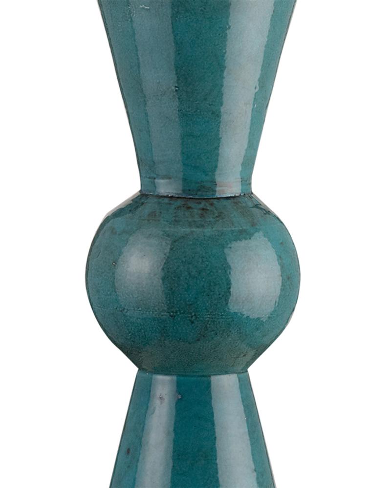 The Upbeat Teal Table Lamp is mod in style. The shapely terracotta body has a center ball with cones extending up toward an off-white linen shade and downward to its culmination. The shade is fastened with a wrought iron finial.