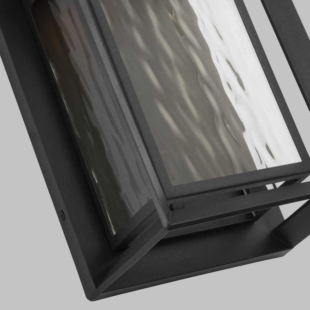 The Urbandale one-light outdoor wall fixture in textured black creates a warm and inviting welcome presentation for your home's exterior. The Urbandale outdoor collection has a modern design that features beveled edges achieved with the fine precision of crisp die-cast construction. Both incandescent and LED versions are available, each offering a slightly different aesthetic. The incandescent version is offered in the Antique Bronze finish, which nicely contrasts with the Painted Burnished Brass finish on the squared-off candle holders and Clear Seeded glass to subtly obscure the light source. The LED version is offered in an Antique Bronze and Textured Black finished with Clear Water glass.