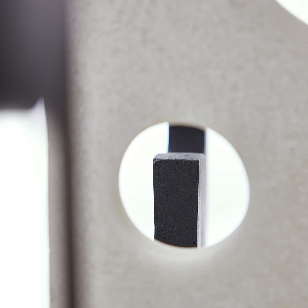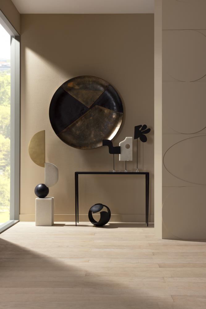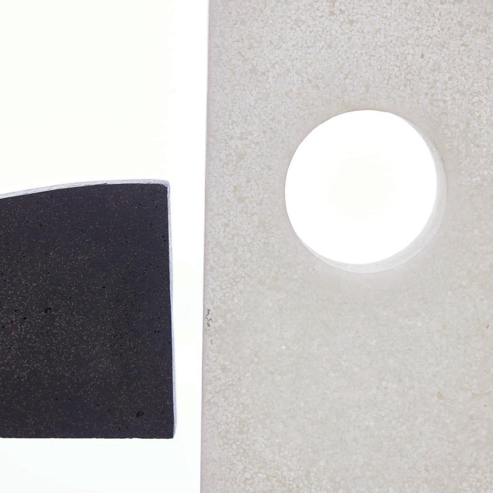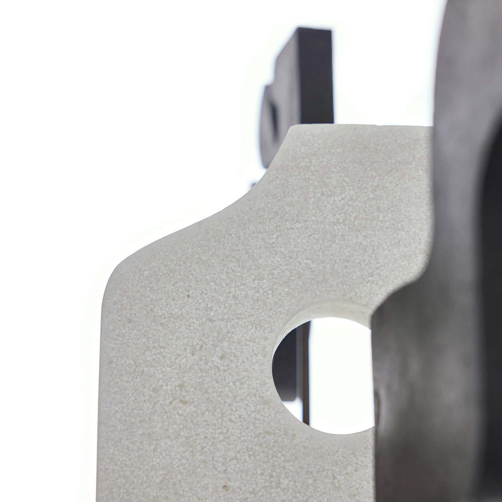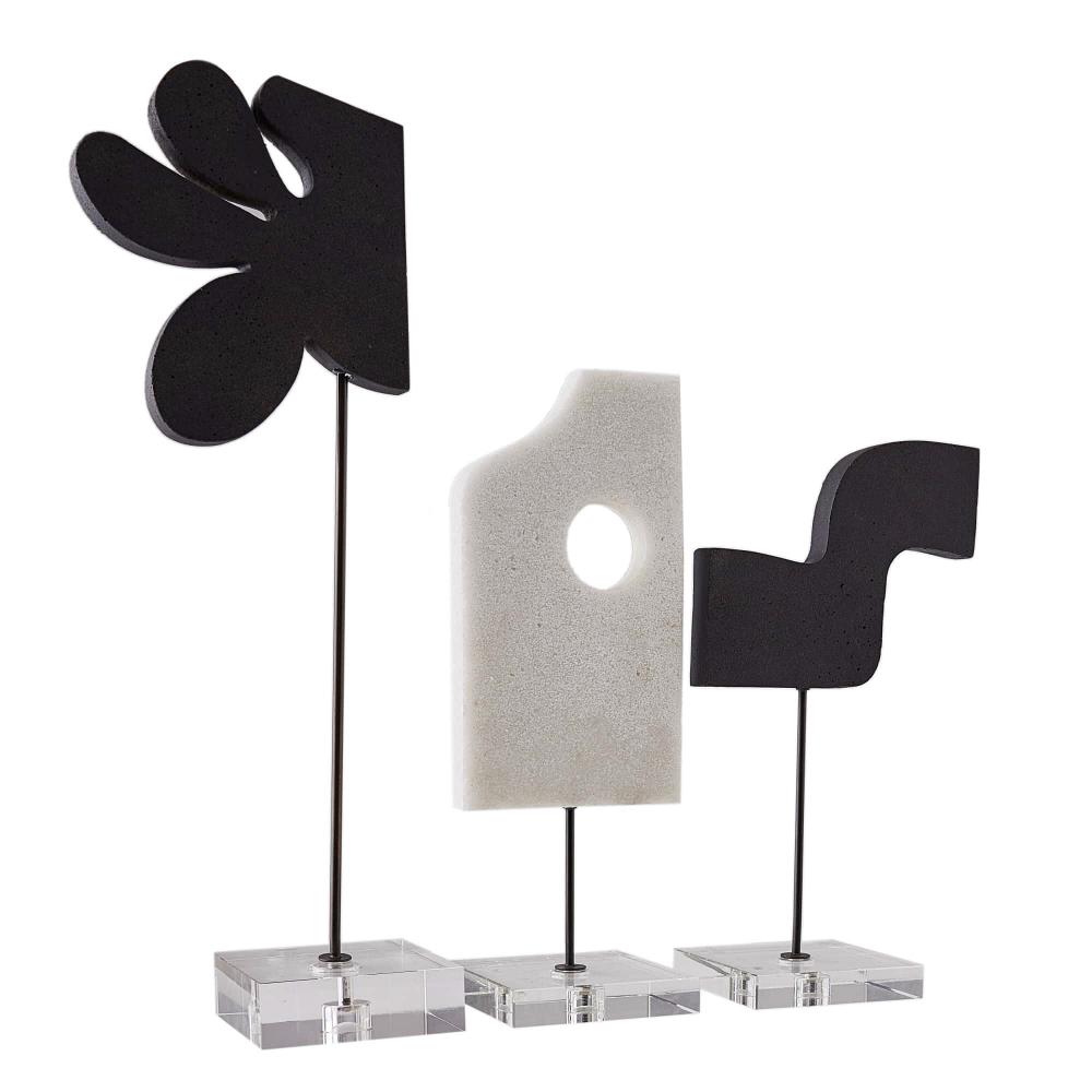 CREATIVELY ROOTED IN ABSTRACT EXPRESSIONISM, THIS TRIO OF URI SCULPTURES FORM A COMBINATION OF UNIQUE COMPOSITIONS TOGETHER OR APART. THE GESTURAL ART PIECES ARE CARVED FROM CONTRASTING CHARCOAL AND IVORY RICESTONE COMPOSITE AND MOUNTED ON BRONZED STEEL, WITH BASES OF CLEAR CRYSTAL. FINISHES WILL VARY.
