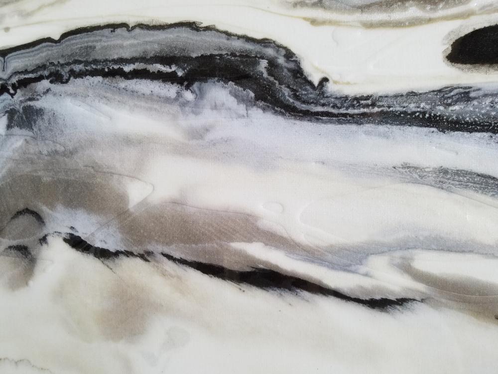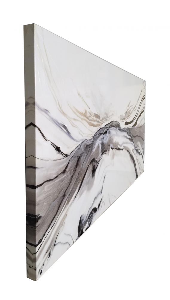 Meandering streaks of color reveal the organic movement of this modern canvas art piece. Winding channels of black, gray, taupe and tan expand and contract against a creamy white background in an artistic exploration of ebb and flow. A high gloss finish adds a touch of shimmer to the tonal color palette while the horizontal format expands the abstract gestures of the wall decoration beyond the confines of the rectangular canvas.