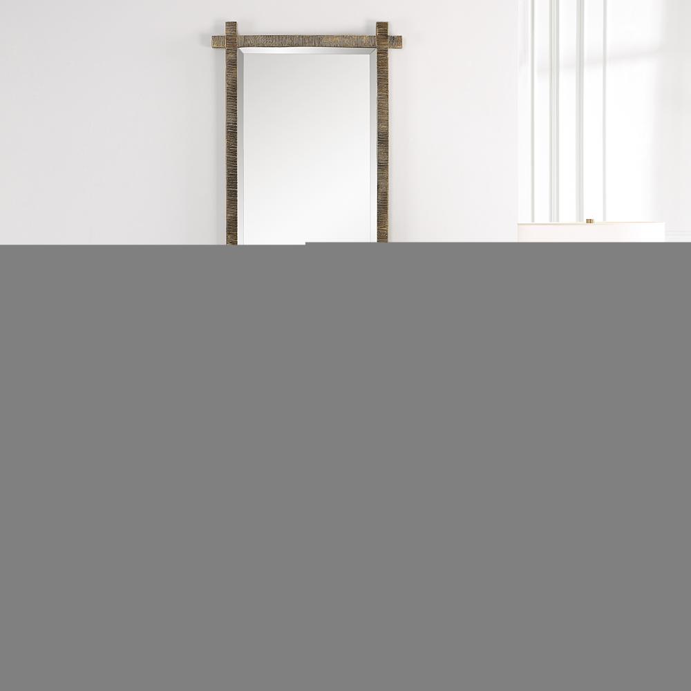This Dressing Mirror Features A Heavily Antique Gold Finished Frame with Ribbed Texture, Adding A Tribal Feel. The Piece Has A Generous 1 1/4" Bevel and May Be Hung Horizontal or Vertical.